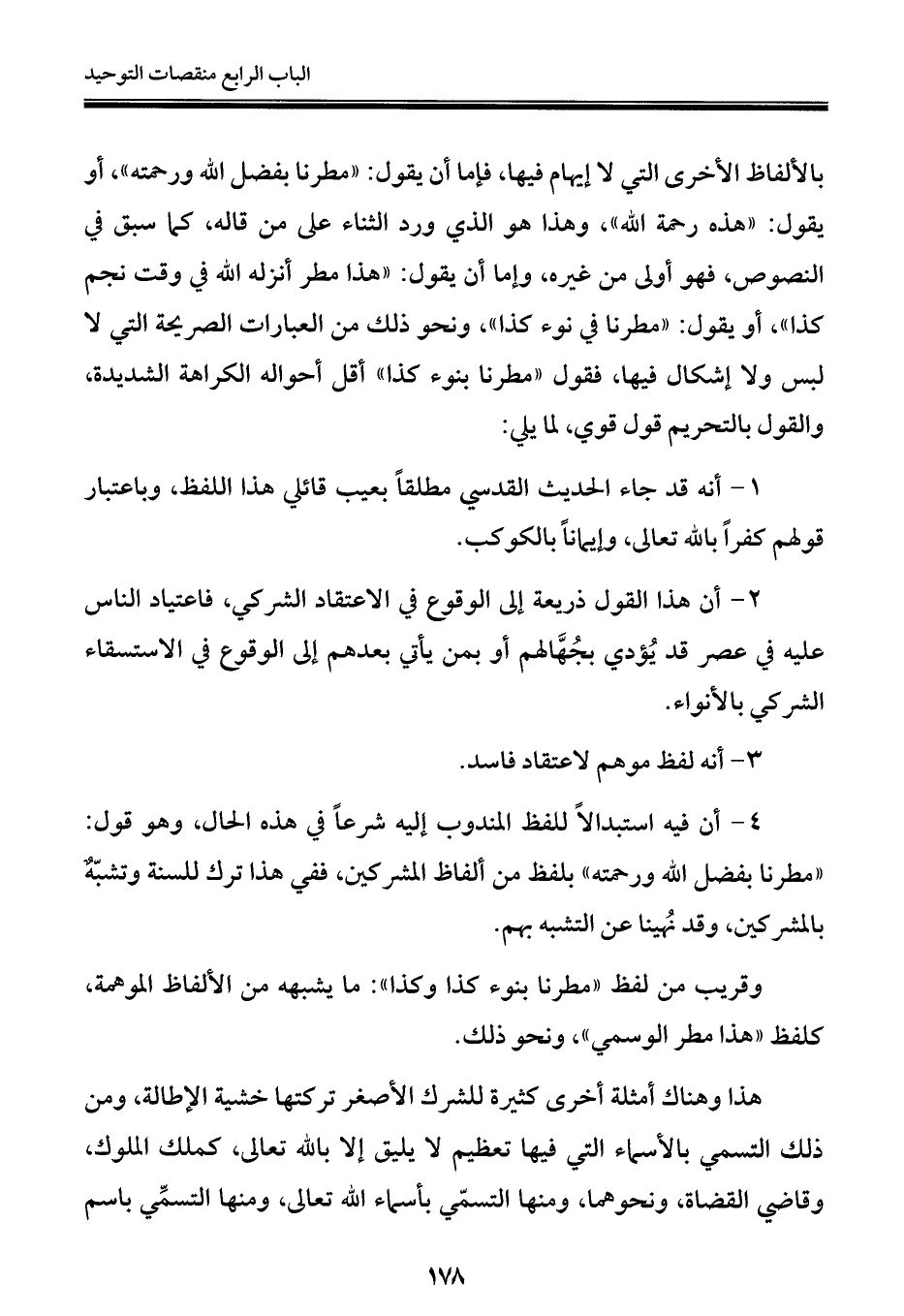 وقريب من لفظ "مطرنا بنوء كذا وكذا": ما يشبهه من الألفاظ الموهمة، كلفظ "هذا مطر الوسمي"، ونحو ذلك.