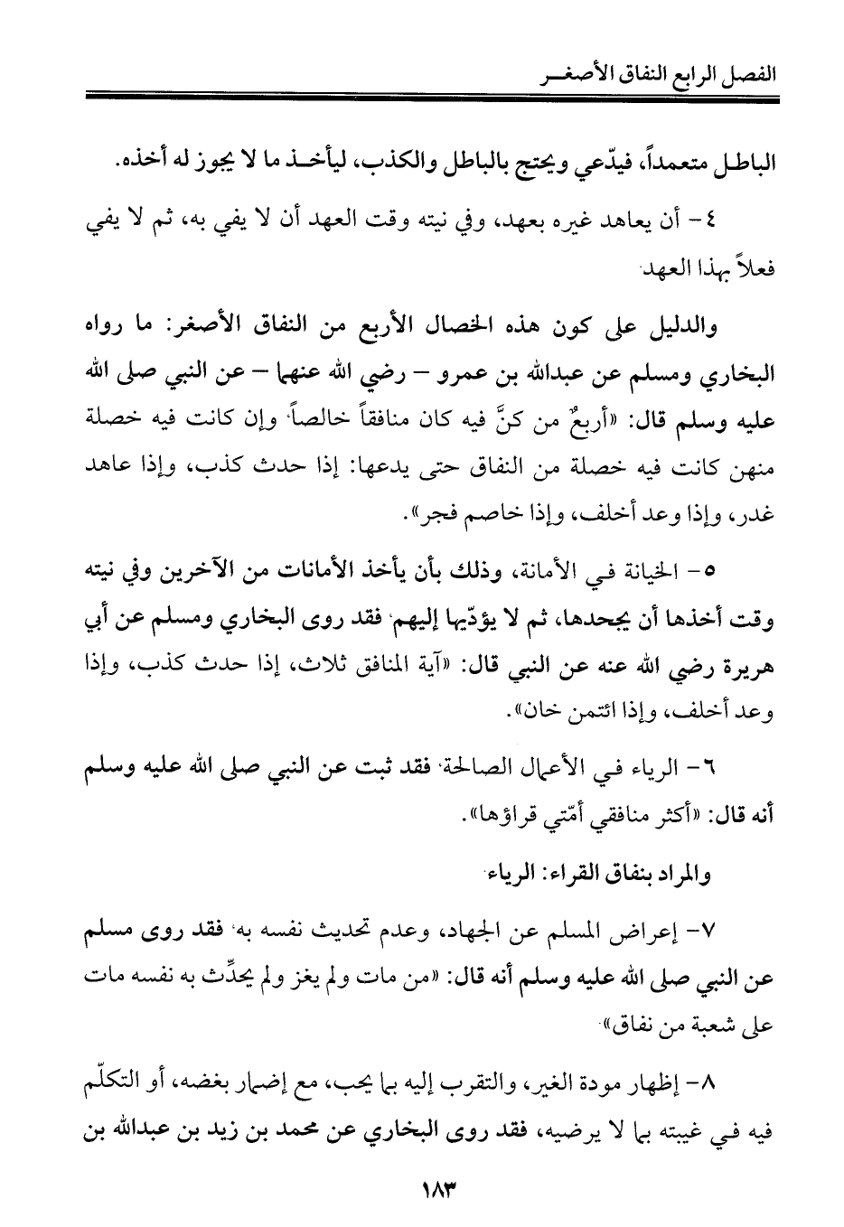 والدليل على كون هذه الخصال الأربع من النفاق الأصغر: ما رواه البخاري ومسلم عن عبد الله بن عمرو - رضي الله عنهما - عن النبي صلى الله عليه وسلم قال: "أربعٌ من كنَّ فيه كان منافقًا خالصًا، وإن كانت فيه خصلة منهن كانت فيه خصلة من النفاق حتى يدعها: إذا حدث كذب، وإذا عاهد غدر، وإذا وعد أخلف، وإذا خاصم فجر".