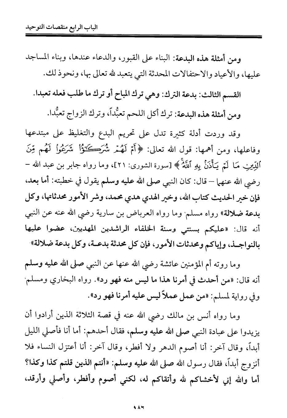 وما روته أم المؤمنين عائشة رضي الله عنها عن النبي صلى الله عليه وسلم أنه قال: "من أحدث في أمرنا هذا ما ليس منه فهو رد". رواه البخاري ومسلم وفي رواية لمسلم: "من عمل عملًا ليس عليه أمرنا فهو رد".