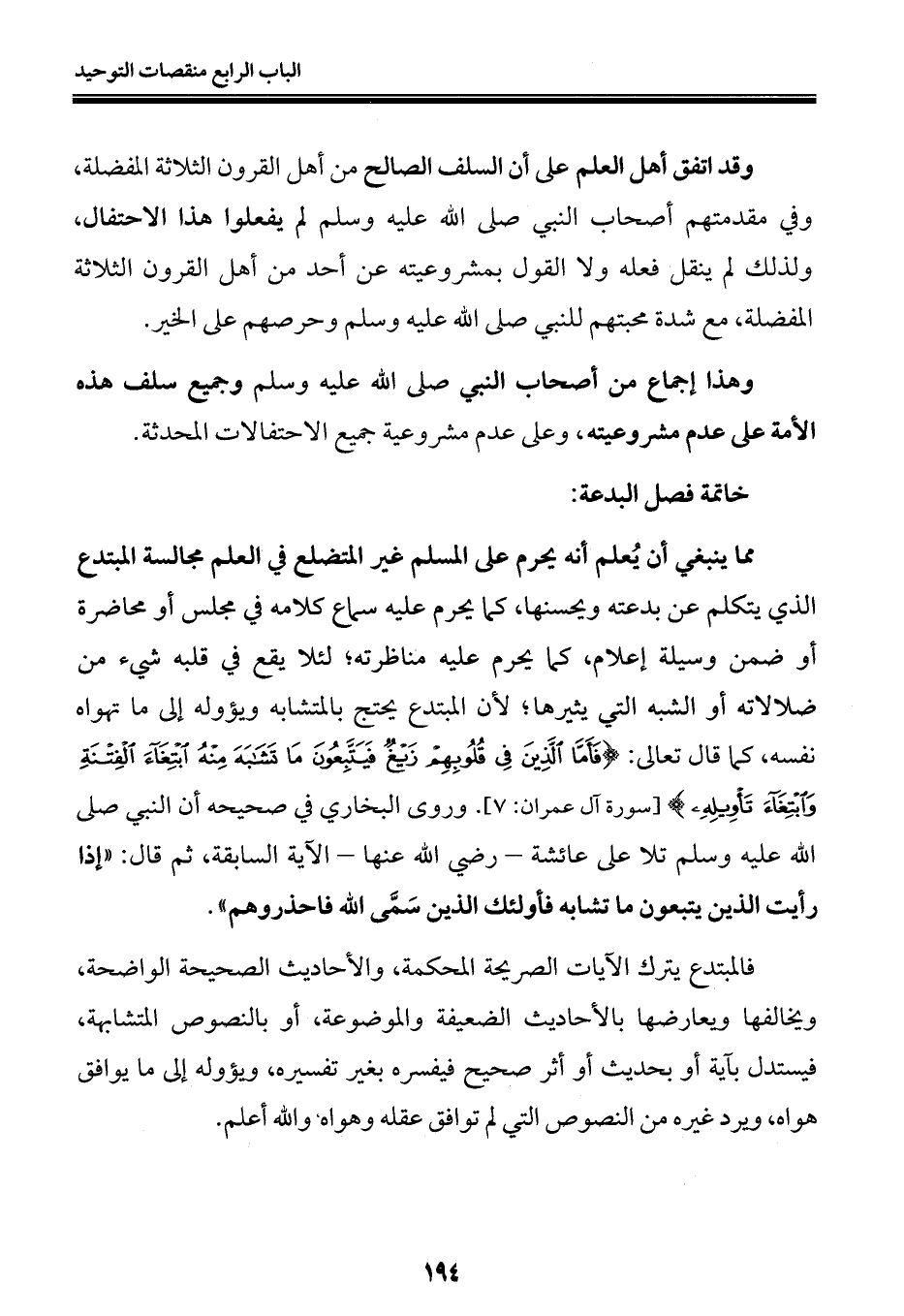 فالمبتدع يترك الآيات الصريحة المحكمة، والأحاديث الصحيحة الواضحة، ويخالفها ويعارضها بالأحاديث الضعيفة والموضوعة، أو بالنصوص المتشابهة، فيستدل بآية أو بحديث أو أثر صحيح فيفسره بغير تفسيره، ويؤوله إلى ما يوافق هواه، ويرد غيره من النصوص التي لم توافق عقله وهواه" والله أعلم.
