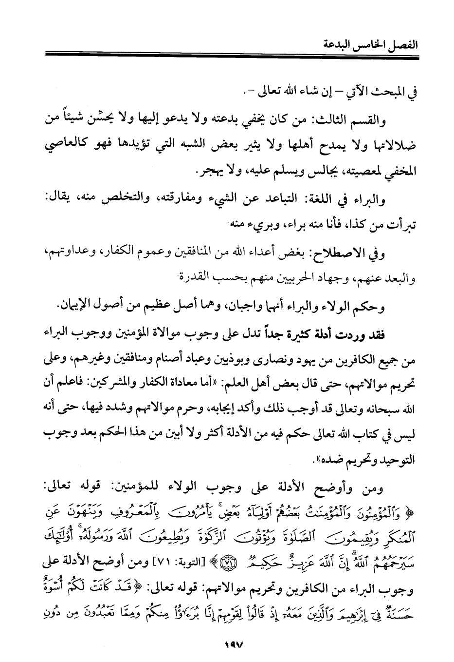 ومن وأوضح الأدلة على وجوب الولاء للمؤمنين: قوله تعالى: {وَالْمُؤْمِنُونَ وَالْمُؤْمِنَاتُ بَعْضُهُمْ أَوْلِيَاءُ بَعْضٍ يَأْمُرُونَ بِالْمَعْرُوفِ وَيَنْهَوْنَ عَنِ الْمُنْكَرِ وَيُقِيمُونَ الصَّلَاةَ وَيُؤْتُونَ الزَّكَاةَ وَيُطِيعُونَ اللَّهَ وَرَسُولَهُ أُولَئِكَ سَيَرْحَمُهُمُ اللَّهُ إِنَّ اللَّهَ عَزِيزٌ حَكِيمٌ (٧١)} [التوبة: ٧١] ومن أوضح الأدلة على وجوب البراء من الكافرين وتحريم موالاتهم: قوله تعالى: {قَدْ كَانَتْ لَكُمْ أُسْوَةٌ حَسَنَةٌ فِي إِبْرَاهِيمَ وَالَّذِينَ مَعَهُ إِذْ قَالُوا لِقَوْمِهِمْ إِنَّا بُرَآءُ مِنْكُمْ وَمِمَّا تَعْبُدُونَ مِنْ دُونِ