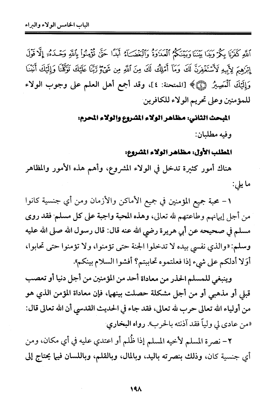 اللَّهِ كَفَرْنَا بِكُمْ وَبَدَا بَيْنَنَا وَبَيْنَكُمُ الْعَدَاوَةُ وَالْبَغْضَاءُ أَبَدًا حَتَّى تُؤْمِنُوا بِاللَّهِ وَحْدَهُ إِلَّا قَوْلَ إِبْرَاهِيمَ لِأَبِيهِ لأَسْتَغْفِرَنَّ لَكَ وَمَا أَمْلِكُ لَكَ مِنَ اللَّهِ مِنْ شَيْءٍ رَبَّنَا عَلَيْكَ تَوَكَّلْنَا وَإِلَيْكَ أَنَبْنَا وَإِلَيْكَ الْمَصِيرُ (٤)} [الممتحنة: ٤]، وقد أجمع أهل العلم على وجوب الولاء للمؤمنين وعلى تحريم الولاء للكافرين.