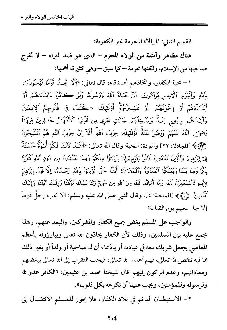 ١ - محبة الكفار، واتخاذهم أصدقاء، قال تعالى: {لَا تَجِدُ قَوْمًا يُؤْمِنُونَ بِاللَّهِ وَالْيَوْمِ الْآخِرِ يُوَادُّونَ مَنْ حَادَّ اللَّهَ وَرَسُولَهُ وَلَوْ كَانُوا آبَاءَهُمْ أَوْ أَبْنَاءَهُمْ أَوْ إِخْوَانَهُمْ أَوْ عَشِيرَتَهُمْ أُولَئِكَ كَتَبَ فِي قُلُوبِهِمُ الْإِيمَانَ وَأَيَّدَهُمْ بِرُوحٍ مِنْهُ وَيُدْخِلُهُمْ جَنَّاتٍ تَجْرِي مِنْ تَحْتِهَا الْأَنْهَارُ خَالِدِينَ فِيهَا رَضِيَ اللَّهُ عَنْهُمْ وَرَضُوا عَنْهُ أُولَئِكَ حِزْبُ اللَّهِ أَلَا إِنَّ حِزْبَ اللَّهِ هُمُ الْمُفْلِحُونَ (٢٢)} [المجادلة: ٢٢] والمودة: المحبة وقال الله تعالى: {قَدْ كَانَتْ لَكُمْ أُسْوَةٌ حَسَنَةٌ فِي إِبْرَاهِيمَ وَالَّذِينَ مَعَهُ إِذْ قَالُوا لِقَوْمِهِمْ إِنَّا بُرَآءُ مِنْكُمْ وَمِمَّا تَعْبُدُونَ مِنْ دُونِ اللَّهِ كَفَرْنَا بِكُمْ وَبَدَا بَيْنَنَا وَبَيْنَكُمُ الْعَدَاوَةُ وَالْبَغْضَاءُ أَبَدًا حَتَّى تُؤْمِنُوا بِاللَّهِ وَحْدَهُ إِلَّا قَوْلَ إِبْرَاهِيمَ لِأَبِيهِ لأَسْتَغْفِرَنَّ لَكَ وَمَا أَمْلِكُ لَكَ مِنَ اللَّهِ مِنْ شَيْءٍ رَبَّنَا عَلَيْكَ تَوَكَّلْنَا وَإِلَيْكَ أَنَبْنَا وَإِلَيْكَ الْمَصِيرُ (٤)} [الممتحنة: ٤]، وقال النَّبِيّ صلى الله عليه وسلم: "لا يحب رجلٌ قومًا إلا جاء معهم يوم القيامة".