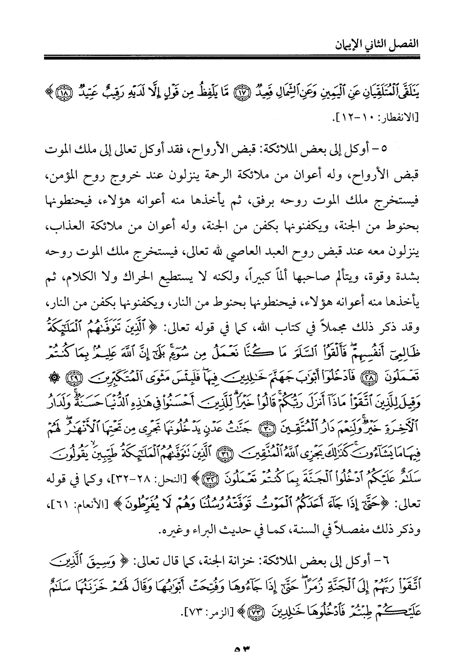 ٥ - أوكل إلى بعض الملائكة: قبض الأرواح، فقد أوكل تعالى إلى ملك الموت قبض الأرواح، وله أعوان من ملائكة الرحمة ينزلون عند خروج روح المؤمن، فيستخرج ملك الموت روحه برفق، ثم يأخذها منه أعوانه هؤلاء، فيحنطونها بحنوط من الجنة، ويكفنونها بكفن من الجنة، وله أعوان من ملائكة العذاب، ينزلون معه عند قبض روح العبد العاصي لله تعالى، فيستخرج ملك الموت روحه بشدة وقوة، ويتألم صاحبها ألمًا كبيرًا، ولكنه لا يستطيع الحراك ولا الكلام، ثم يأخذها منه أعوانه هؤلاء، فيحنطونها بحنوط من النار، ويكفنونها بكفن من النار، وقد ذكر ذلك مجملًا في كتاب الله، كما في قوله تعالى: {الَّذِينَ تَتَوَفَّاهُمُ الْمَلَائِكَةُ ظَالِمِي أَنْفُسِهِمْ فَأَلْقَوُا السَّلَمَ مَا كُنَّا نَعْمَلُ مِنْ سُوءٍ بَلَى إِنَّ اللَّهَ عَلِيمٌ بِمَا كُنْتُمْ تَعْمَلُونَ (٢٨) فَادْخُلُوا أَبْوَابَ جَهَنَّمَ خَالِدِينَ فِيهَا فَلَبِئْسَ مَثْوَى الْمُتَكَبِّرِينَ (٢٩) وَقِيلَ لِلَّذِينَ اتَّقَوْا مَاذَا أَنْزَلَ رَبُّكُمْ قَالُوا خَيْرًا لِلَّذِينَ أَحْسَنُوا فِي هَذِهِ الدُّنْيَا حَسَنَةٌ وَلَدَارُ الْآخِرَةِ خَيْرٌ وَلَنِعْمَ دَارُ الْمُتَّقِينَ (٣٠) جَنَّاتُ عَدْنٍ يَدْخُلُونَهَا تَجْرِي مِنْ تَحْتِهَا الْأَنْهَارُ لَهُمْ فِيهَا مَا يَشَاءُونَ كَذَلِكَ يَجْزِي اللَّهُ الْمُتَّقِينَ (٣١) الَّذِينَ تَتَوَفَّاهُمُ الْمَلَائِكَةُ طَيِّبِينَ يَقُولُونَ سَلَامٌ عَلَيْكُمُ ادْخُلُوا الْجَنَّةَ بِمَا كُنْتُمْ تَعْمَلُونَ (٣٢)} [النحل: ٢٨ - ٣٢]، وكما في قوله تعالى: {حَتَّى إِذَا جَاءَ أَحَدَكُمُ الْمَوْتُ تَوَفَّتْهُ رُسُلُنَا وَهُمْ لَا يُفَرِّطُونَ} [الأنعام: ٦١] وذكر ذلك مفصلًا في السنة، كما في حديث البراء وغيره.