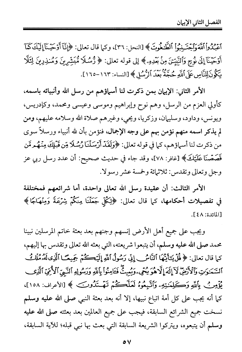 الأمر الثاني: الإيمان بمن ذكرت لنا أسماؤهم من رسل الله وأنبيائه باسمه، كأولي العزم من الرسل، وهم نوح وإبراهيم وموسى وعيسى ومحمد، وكإدريس، ويونس، وداود، وسليمان، وزكريا، ويحيى، وغيرهم صلاة الله وسلامه عليهم، ومن لم يذكر اسمه منهم نؤمن بهم على وجه الإجمال، فنؤمن بأن لله أنبياء ورسلًا سوى من ذكرت لنا أسماؤهم، كما في قوله تعالى: {وَلَقَدْ أَرْسَلْنَا رُسُلًا مِنْ قَبْلِكَ مِنْهُمْ مَنْ قَصَصْنَا عَلَيْكَ} [غافر: ٧٨]، وقد جاء في حديث صحيح: أن عدد رسل ربي عز وجل وتعالى وتقدس: ثلاثمائة وخمسة عشر رسولا.