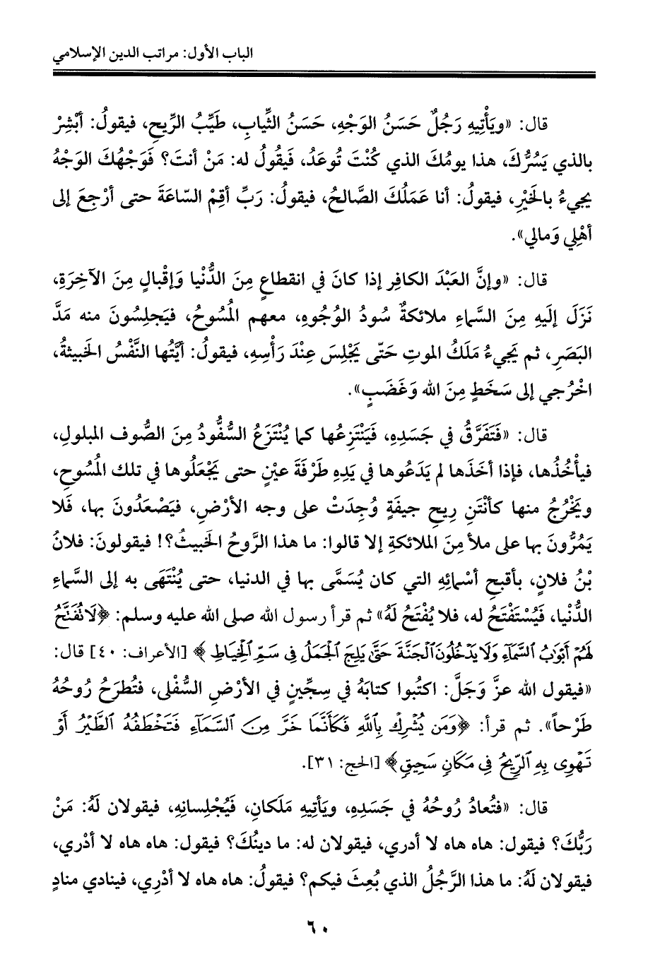 قال: "ويَأْتِيهِ رَجُلٌ حَسَنُ الوَجْهِ، حَسَنُ الثِّيابِ، طَيِّبُ الرِّيحِ، فيقولُ: أبْشِرْ بالذي يَسُرُّكَ، هذا يومُكَ الذي كُنْتَ تُوعَدُ، فَيقُولُ له: مَنْ أنتَ؟ فَوَجْهُكَ الوَجْهُ يجيءُ بالخَيْرِ، فيقولُ: أنا عَمَلُكَ الصَّالحُ، فيقولُ: رَبِّ أقِمْ السّاعَةَ حتى أرْجعَ إلى أهلي وَمالي".