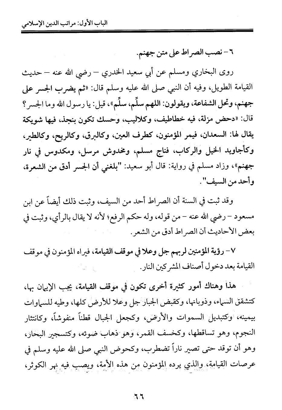 روى البخاري ومسلم عن أبي سعيد الخدري - رضي الله عنه - حديث القيامة الطويل، وفيه أن النبي صلى الله عليه وسلم قال: "ثم يضرب الجسر على جهنم، وتحل الشفاعة، ويقولون: اللهم سلِّم، سلِّم"، قيل: يا رسول الله وما الجسر؟ قال: "دحض مزلة، فيه خطاطيف، وكلاليب، وحسك تكون بنجذ، فيها شويكة يقال لها: السعدان، فيمر المؤمنون، كطرف العين، وكالبرق، وكالريح، وكالطير، وكأجاويد الخيل والركاب، فناج مسلم، ومخدوش مرسل، ومكدوس في نار جهنم"، وزاد مسلم في رواية: قال أبو سعيد: "بلغني أن الجسر أدق من الشعرة، وأحد من السيف".