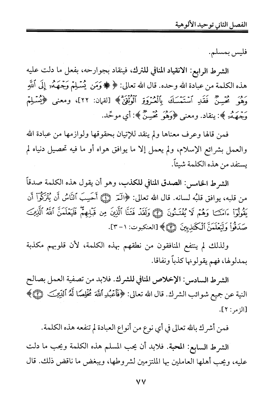 الشرط الرابع: الانقياد المنافي للترك، فينقاد بجوارحه، بفعل ما دلت عليه هذه الكلمة من عبادة الله وحده. قال الله تعالى: {وَمَنْ يُسْلِمْ وَجْهَهُ إِلَى اللَّهِ وَهُوَ مُحْسِنٌ فَقَدِ اسْتَمْسَكَ بِالْعُرْوَةِ الْوُثْقَى} [لقمان: ٢٢]، ومعنى {يُسْلِمْ وَجْهَهُ}: ينقاد. ومعنى {وَهُوَ مُحْسِنٌ}: أي موحِّد.