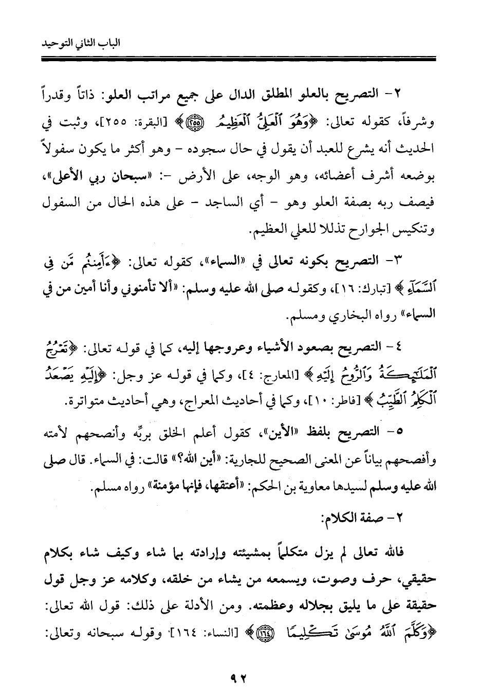 ٢ - التصريح بالعلو المطلق الدال على جميع مراتب العلو: ذاتًا وقدرًا وشرفًا، كقوله تعالى {وَهُوَ الْعَلِيُّ الْعَظِيمُ (٢٥٥)} [البقرة: ٢٥٥]، وثبت في الحديث أنه يشرع للعبد أن يقول في حال سجوده - وهو أكثر ما يكون سفولًا بوضعه أشرف أعضائه، وهو الوجه، على الأرض -: "سبحان ربي الأعلى"، فيصف ربه بصفة العلو وهو - أي الساجد - على هذه الحال من السفول وتنكيس الجوارح تذللا للعلي العظيم.