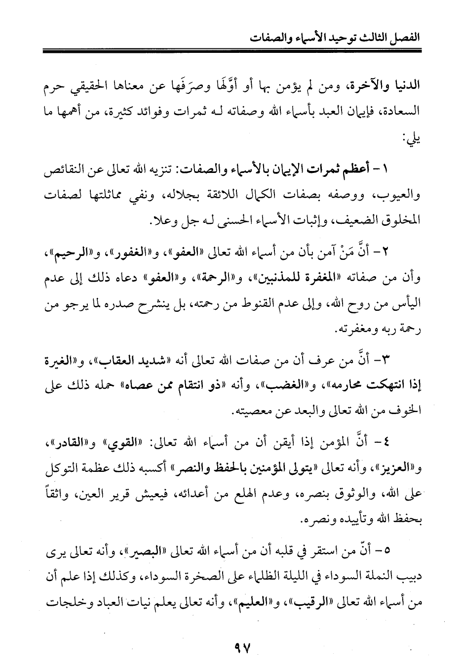 الدنيا والآخرة، ومن لم يؤمن بها أو أوَّلَها وصرَفَها عن معناها الحقيقي حرم السعادة، فإيمان العبد بأسماء الله وصفاته له ثمرات وفوائد كثيرة، من أهمها ما يلي: