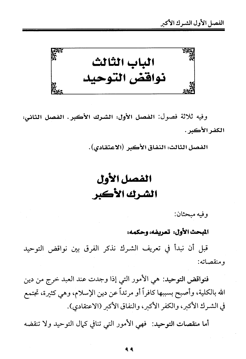 وفيه ثلاثة فصول: الفصل الأول: الشرك الأكبر. الفصل الثاني: الكفر الأكبر.