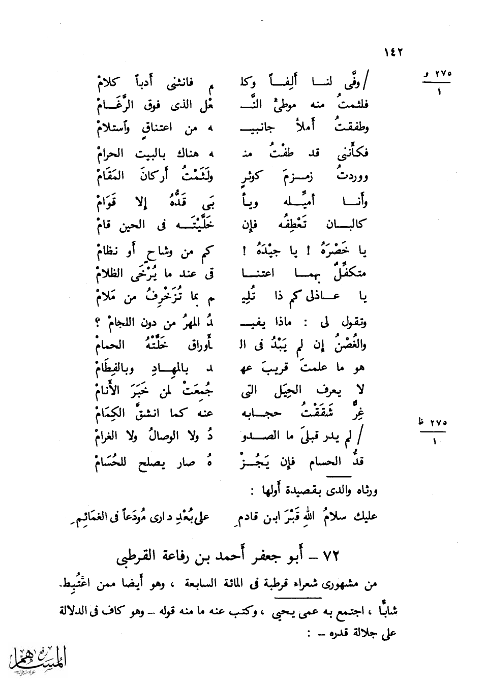وَقَالَ هَذَا أشبه بالأمير وأليق فَعظم فِي عينه من ذَلِك الْحِين وَلم يزل قاضيه إِلَى أَن مَاتَ إِلَّا سنتَيْن عَزله فِيهَا لسَبَب ثمَّ رده وجاءه رجل بوثيقة فِيهَا شهد الْوَزير هَاشم بن عبد الْعَزِيز فَقَالَ لَهُ لَا بُد من أَن يأتيني هَاشم يشْهد عِنْدِي فَمضى الرجل إِلَيْهِ فَقَالَ لَهُ لست من أهل الشَّهَادَات فَقَالَ يَا سَيِّدي اتَّقِ الله فِي فبك تتمّ حَاجَتي وَالْقَاضِي دَعَاني إِلَيْك فَلَمَّا سمع هَاشم ذَلِك طمع أَن يسجل القَاضِي بِشَهَادَتِهِ فَيكون ذَلِك فخراً بَاقِيا لَهُ فَركب هَاشم إِلَى مَجْلِسه وَشهد عِنْده وَمضى وَكَانَ مَعَ شَهَادَته شَهَادَة عدل فَقَالَ القَاضِي للرجل زِدْنِي شَهَادَة عدل ثَان فَظهر أَن القَاضِي كَاد هاشماً وَبلغ ذَلِك مُحَمَّدًا فنقص بِهِ عقله لجَوَاز كيد القَاضِي عَلَيْهِ