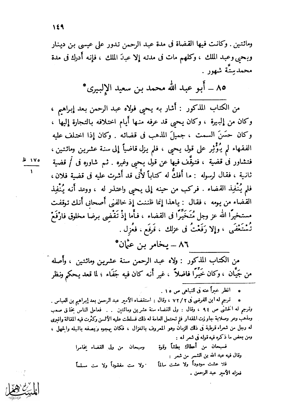 من كتاب ابْن حَيَّان أَن هشاماً المعتد ولاه بعد ابْن الْحصار فَلم يقبل إِلَّا بعد الْجهد من الكبراء وَلم يزل قَاضِيا إِلَى أَن هلك لَيْلَة الْجُمُعَة لثلاث بَقينَ من رَجَب سنة تسعع وَعشْرين وَأَرْبَعمِائَة وَصَارَ خَاتِمَة الْقُضَاة بقرطبة وَآخر الخطباء الْمَعْدُودين فِيهَا وتأريخ الْمُحدثين لَا يُنَازع فِي هَذِه الْمَرَاتِب على مَا أخل بِهِ من تَمام الْخِصَال الَّتِي اجْتمعت لمن قبله وَهلك وَهُوَ أسْند من بَقِي بالأندلس وأوسعهم جمعا وَأَعْلَاهُمْ سنا زَاد على التسعين سِتَّة أشهر وَهُوَ مَعَ ذَلِك ممتع بحواسه يستبين الْخط الدَّقِيق ويرتحل الْخطب الطوَال وَلَا يدع التَّأْلِيف وَله كتب حسان فِي الزّهْد وَالرَّقَائِق وَغَيرهَا وَكَانَ على تفرده بِالْحَدِيثِ مُتَقَدما فِي علم اللِّسَان والآداب رِوَايَة للشعر وَالْخَبَر حسن البلاغة خَطِيبًا ذريا سريع الدمعة لَهُ ضلع صَالح فِي الشّعْر أسعده فِي الصِّبَا على الرَّقِيق وَفِي المشيب على الْوَعْظ