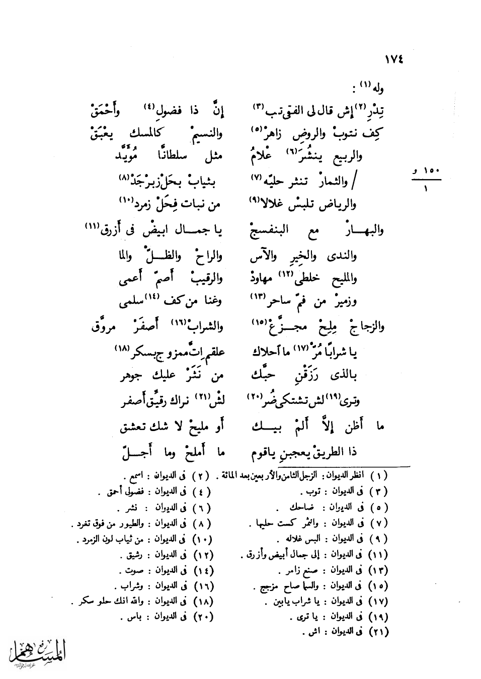 وَكَانَت عَلامَة سكره وَأمر ندمانه بِالْقيامِ أَن يمِيل بِرَأْسِهِ إِلَى حجره وَرُبمَا انشد ... وَكَانَ أشربها وَاللَّيْل معتكر ... حَتَّى أكب الْكرَى رَأْسِي على قدحي ...