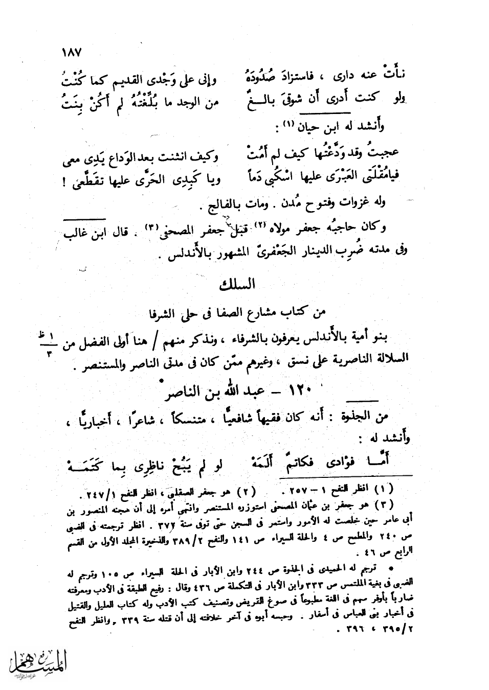 من السقط أَنه من متميزي المروانيين وشعرائهم وَكَانَ المظفر بن أبي عَامر يحسن لَهُ وَله فِيهِ أمداح مِنْهَا قَوْله ... إِن المظفر لَا يزَال مظفراً ... حكما من الرَّحْمَن غير مبدل