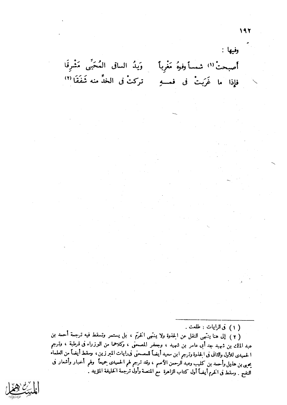 وَمن فرحة الْأَنْفس دَامَت دولته سِتا وَعشْرين سنة فِيهَا اثْنَتَانِ وَعِشْرُونَ غَزْوَة وَمن المسهب أَنه اسْتَعَانَ أَولا بالمصحفي على الصقالبة ثمَّ بغالب على المصحفي ثمَّ بِجَعْفَر ممدوح ابْن هَانِئ على غَالب ثمَّ بِعَبْد الرَّحْمَن بن هَاشم التجِيبِي على جَعْفَر وَعدا بِنَفسِهِ على عبد الرَّحْمَن وَقَالَ للدهر هَل من مبارز