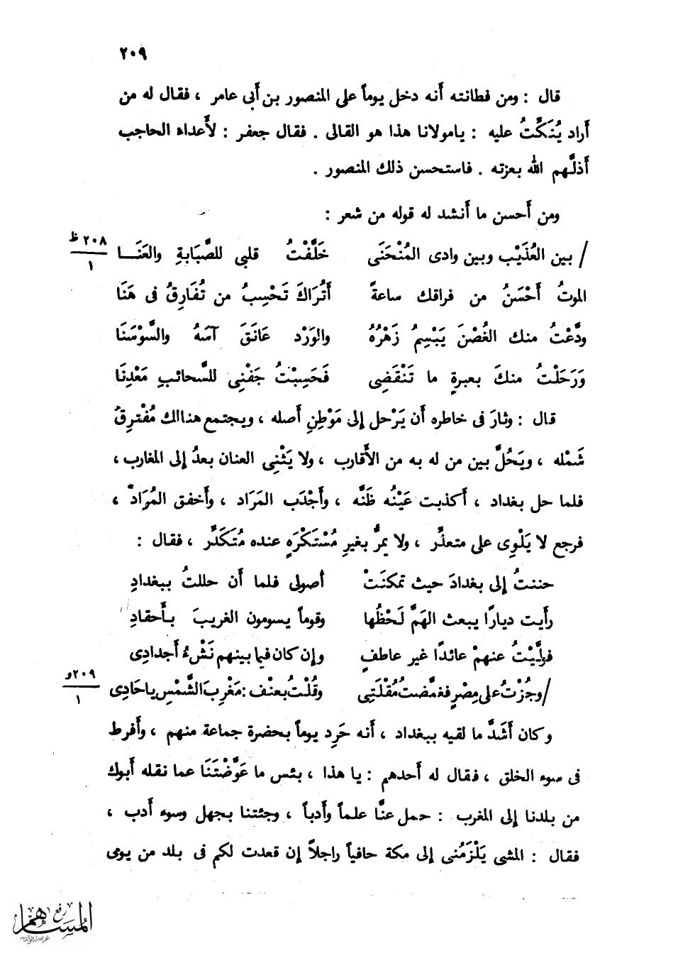 فَقَالَ لَهُ الْوَزير يَا أَبَا الْوَلِيد هَذَا الظبي نفارك فَمن تواقك فَخَجِلَ وَله ... عللاني بِذكر من هَمت فِيهِ ... وعداني عَنهُ بِمَا أرتجيه