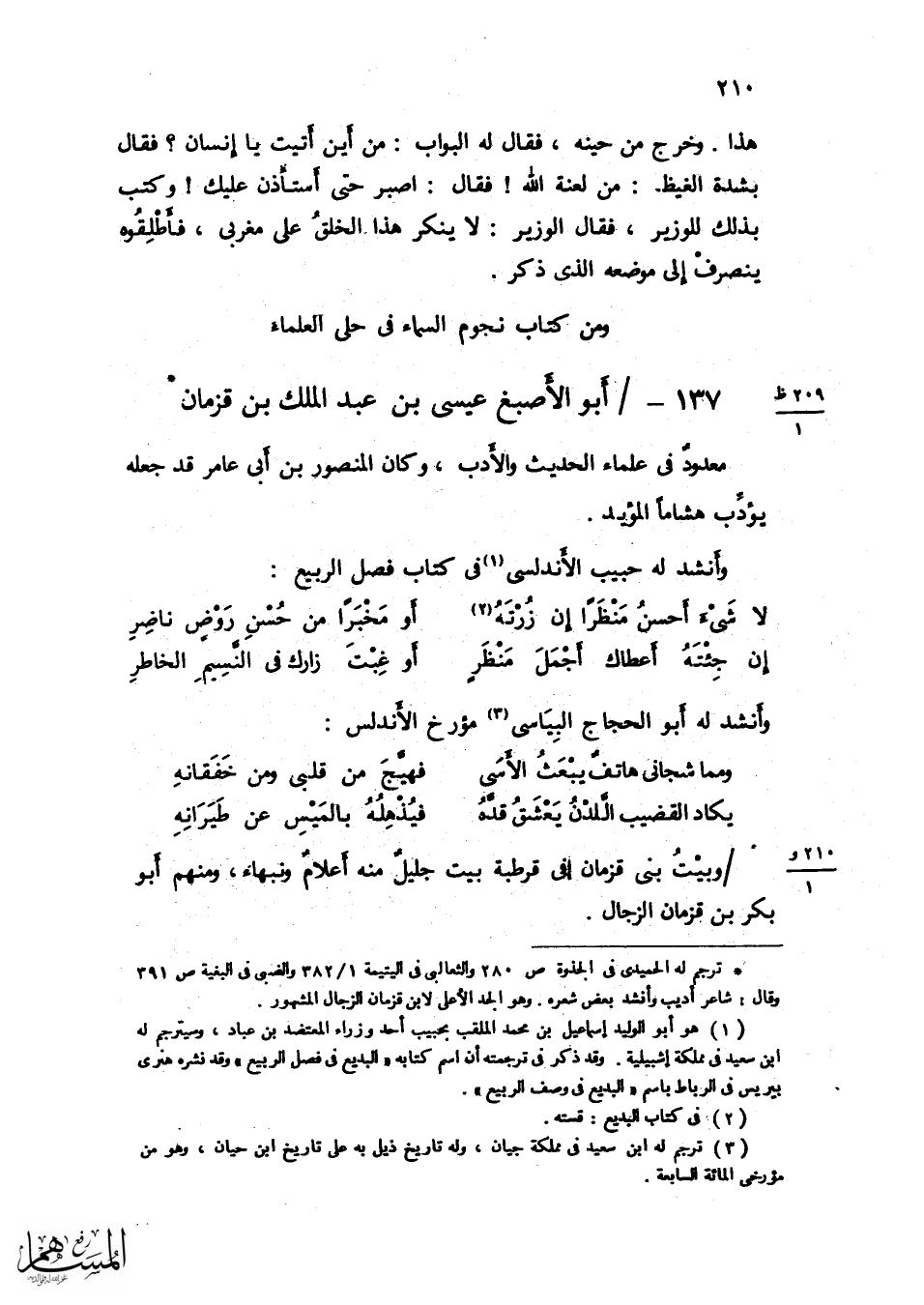 خطيب جَامع قرطبة الْمصدر بِهِ فِي الْمِائَة السَّابِعَة لإقراء النَّحْو وفنون الْأَدَب الْمَشْهُور بالظرف واللطافة كَانَ يعشق غُلَاما اسْمه عِيسَى فَقَرَأَ عَلَيْهِ غُلَام اسْمه مُحَمَّد فَمَال إِلَيْهِ وَقَالَ ... تبدلت من عِيسَى بحب مُحَمَّد ... هديت وَلَوْلَا الله مَا كنت أهتدي