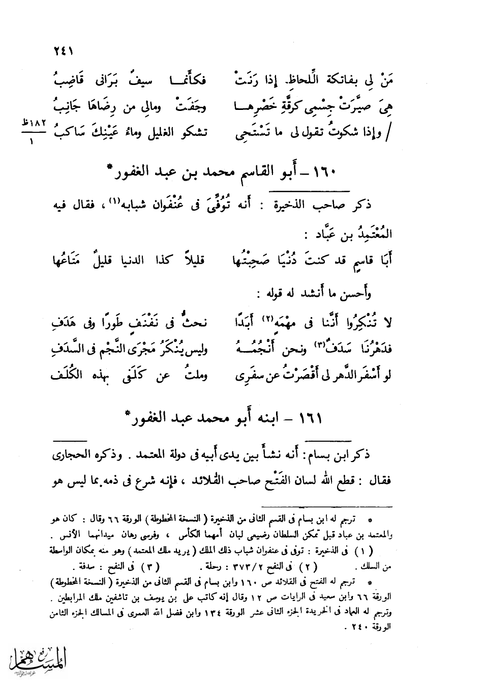 وَأخْبر أَن ابْن زيدون لم يزل يسْعَى فِي حتفه بمكره حَتَّى فتك بِهِ المعتضد بن عباد وَأحسن مَا أنْشدهُ لَهُ قَوْله ... وَمَا هاجني إِلَّا ابْن وَرْقَاء هَاتِف ... على فنن بَين الجزيرة وَالنّهر
