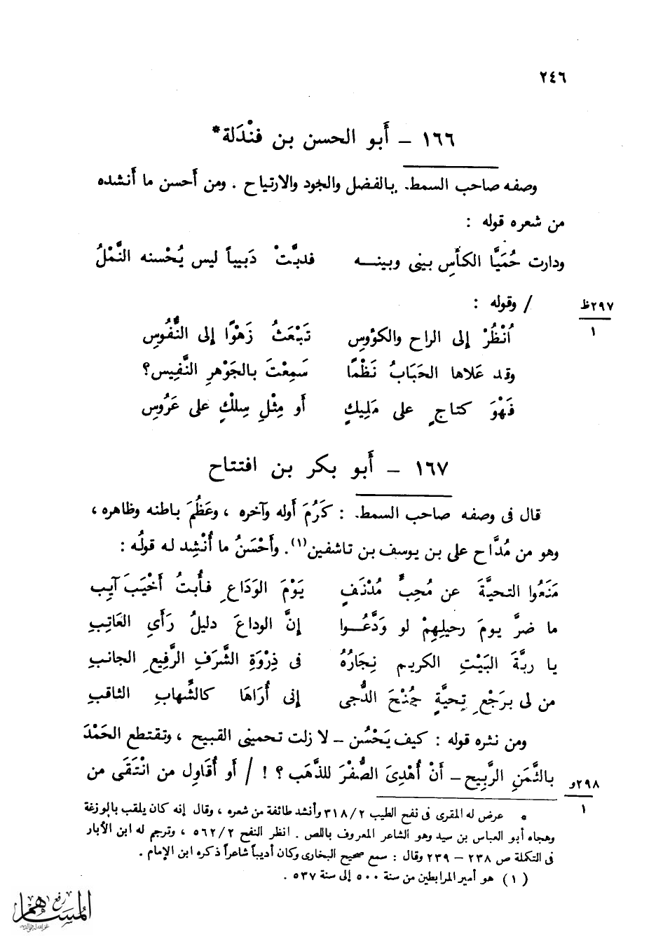 وَاخْتصرَ كتاب الْعين للخليل وَأنْشد لَهُ قَوْله يُخَاطب جَارِيَة كَانَ يُحِبهَا وَقد اسْتَأْذن الْمُسْتَنْصر فِي الْعود إِلَى إشبيلية فَلم يَأْذَن لَهُ ... وَيحك يَا سلم لَا تراعي ... لَا بُد للبين من زماع