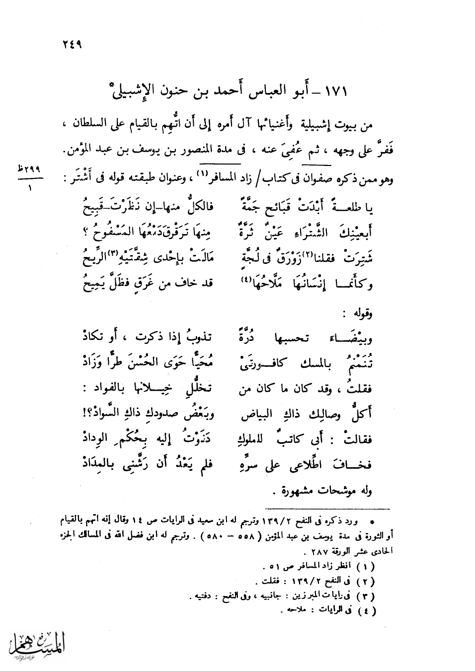 ذكر صَاحب القلائد أَنه أحد أدباء إشبيلية وَوَصفه بِكَثْرَة الارتياح والفرح والانتهاك فِي حب الغلمان وَبِذَلِك وَصفه الحجاري وَأنْشد لَهُ قَوْله ... ركبنَا على اسْم الله نَهرا كَأَنَّهُ ... جمان على عطفيه وشي حباب