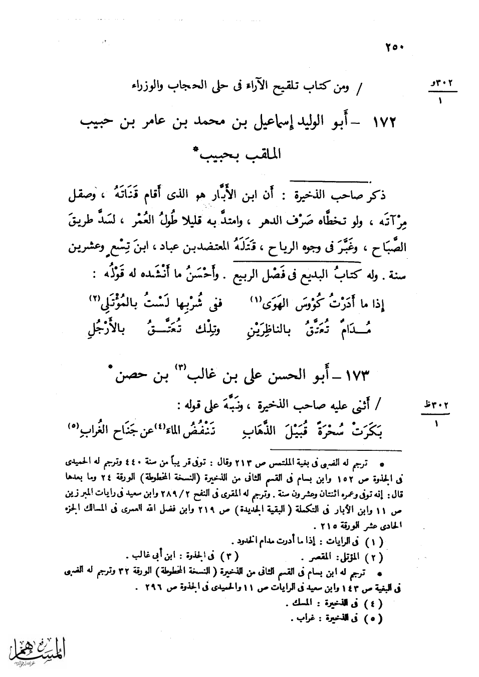وَمن سمط الجمان أَن التَّكَلُّم فِي شَأْنه وإعمال الْقَلَم فِي وصف تجلفه وخذلانه إخلال بِالْبَيَانِ وإضاعة للزمان فآثرنا فِي أمره الِاخْتِصَار وتمثلنا قَول الْقَائِل كل الثِّمَار وخل الْعود للنار وَأما سَهْمه فِي الْكِتَابَة وَعلمه الْمَرْفُوع فِي ميادين الخطابة فسهم اصابة وَعلم عرابة وَمَا أحسن مَا أنْشدهُ من شعره قَوْله ... سقى أَرض حمص بالاصيل بالضحى ... سَحَاب كدمعي يستهل ويسجم