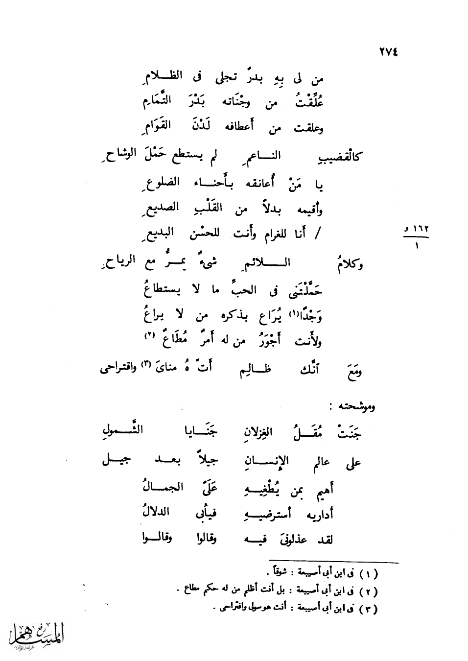 ذكره الدّباغ وَأنْشد من ملحه قَوْله ... حن نلتقيه يحتشم