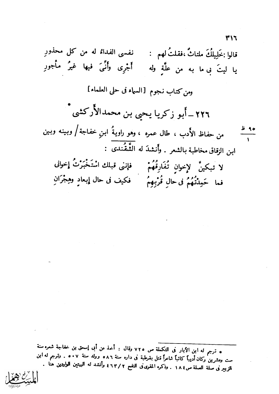 لَقيته بالجزيرة فَلَقِيت خير من يلقى تأنسيا وَبرا وكرماً مَعَ تصرف فِي الْأَدَب وَمَعْرِفَة بالشعر وَقَول لَهُ وَتركته هُنَالك ثمَّ بَلغنِي أَنه سعى بِهِ إِلَى السُّلْطَان فنفي من الْبَلَد وَفرق بَينه وَبَين الْأَهْل وَالْولد وَمَات طريداً غَرِيبا رَحْمَة الله عَلَيْهِ فقد كَانَ مألفاً ومقصداً لغرباء الْأَدَب وَلَقَد مر لي مَعَ أَيَّام لَا يزَال يتمثلها الضَّمِير فتميد عَلَيْهَا أغصانه ويتذكرها فتشوقه أَكثر مِمَّا تشوقه أوطانه كتبت إِلَيْهِ فِي يَوْم أنس سمح بِهِ الزَّمَان فكمله وَبلغ من ساعده مَا تمناه وأمله ... أَبَا الْعَبَّاس لَو أَبْصرت حَولي ... ندامي بَادرُوا الْعَيْش الهنيا ...