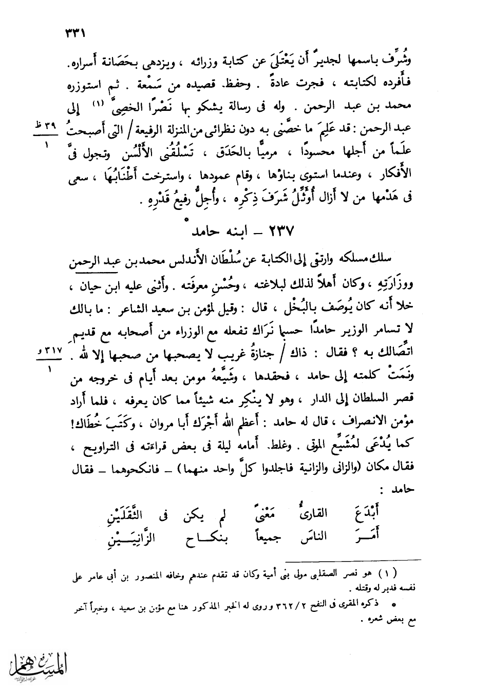 وَمن = كتاب القلائد راصع ثدي الْمَعَالِي المتواضع العالي آيَة الإعجاز فِي الصُّدُور والأعجاز جمع طبع الْعرَاق وصنعة الْحجاز وأقطع استعارته جَانِبي الْحَقِيقَة وَالْمجَاز وَأنْشد من شعره قَوْله ... أما ونسيم الرَّوْض طَابَ بِهِ فجر ... وهب لَهُ من كل زاهرة نشر