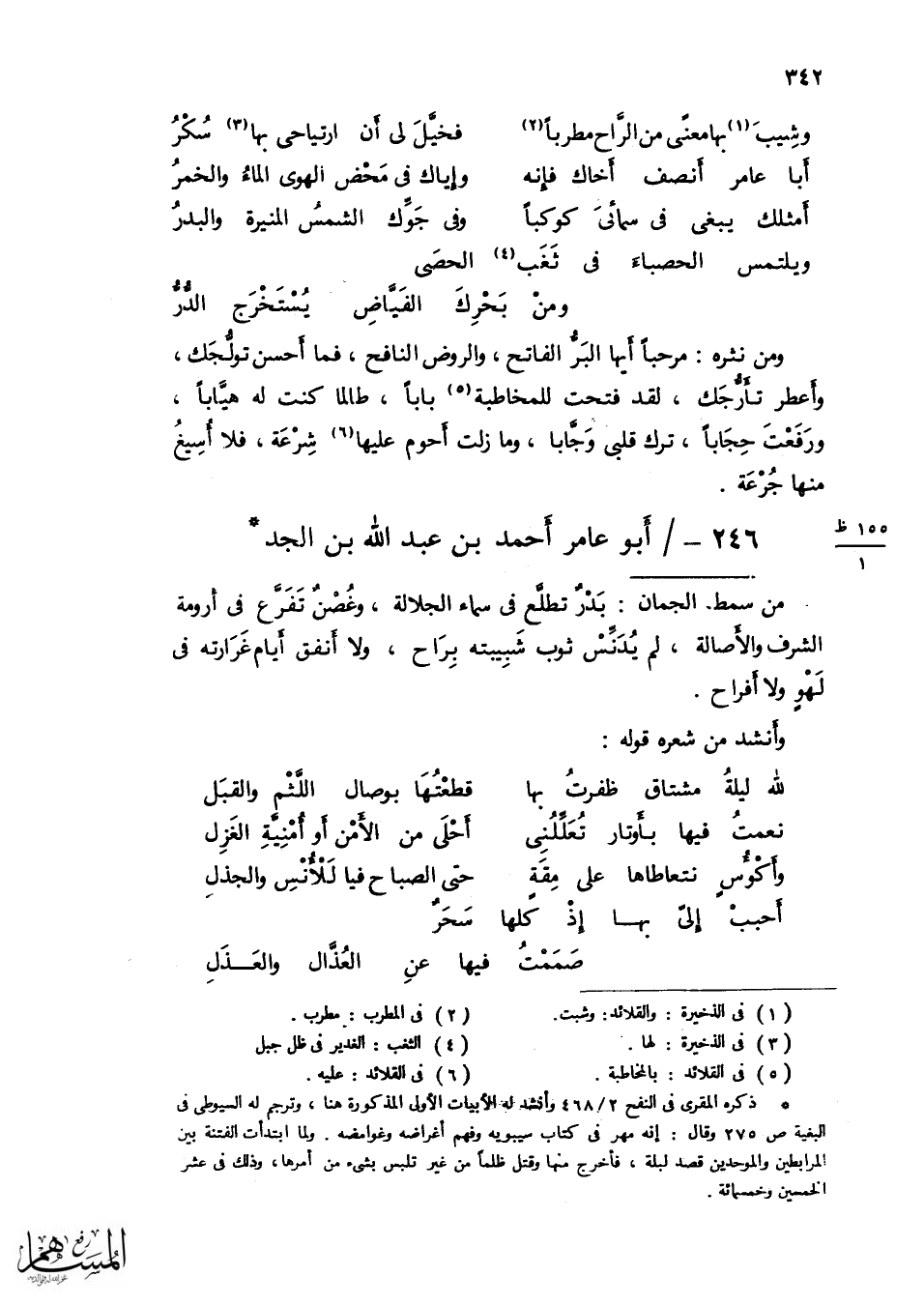 من السمط ذُو المنزع اللَّطِيف والتلون الظريف وسالك مهيع ابْن العريف وملبس سوقة الْمعَانِي حلل اللَّفْظ الشريف كَانَ حِين تهدل غصون آدابه وترفل أَيَّام شبابه فِي ذيول أرابه يندى مَجْلِسه بقطر الْأَدَب الغض ويفري الفرى لِسَانه وَعَيناهُ لَا يبرح مغرزها من الأَرْض عنوان مَا أوردهُ من نثره