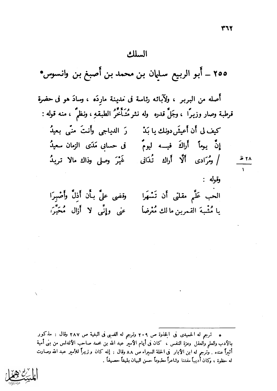 من المسهب بَنو مَوْلُود أَعْيَان مدلين ونجب مِنْهُم أَبُو زيد وَعلا إِلَى دَرَجَات الوزراء وَالْكتاب عِنْد المتَوَكل بن الْأَفْطَس وَمن شعره قَوْله ... أَرِنِي يَوْمًا من الدَّهْر ... على وفْق الْأَمَانِي
