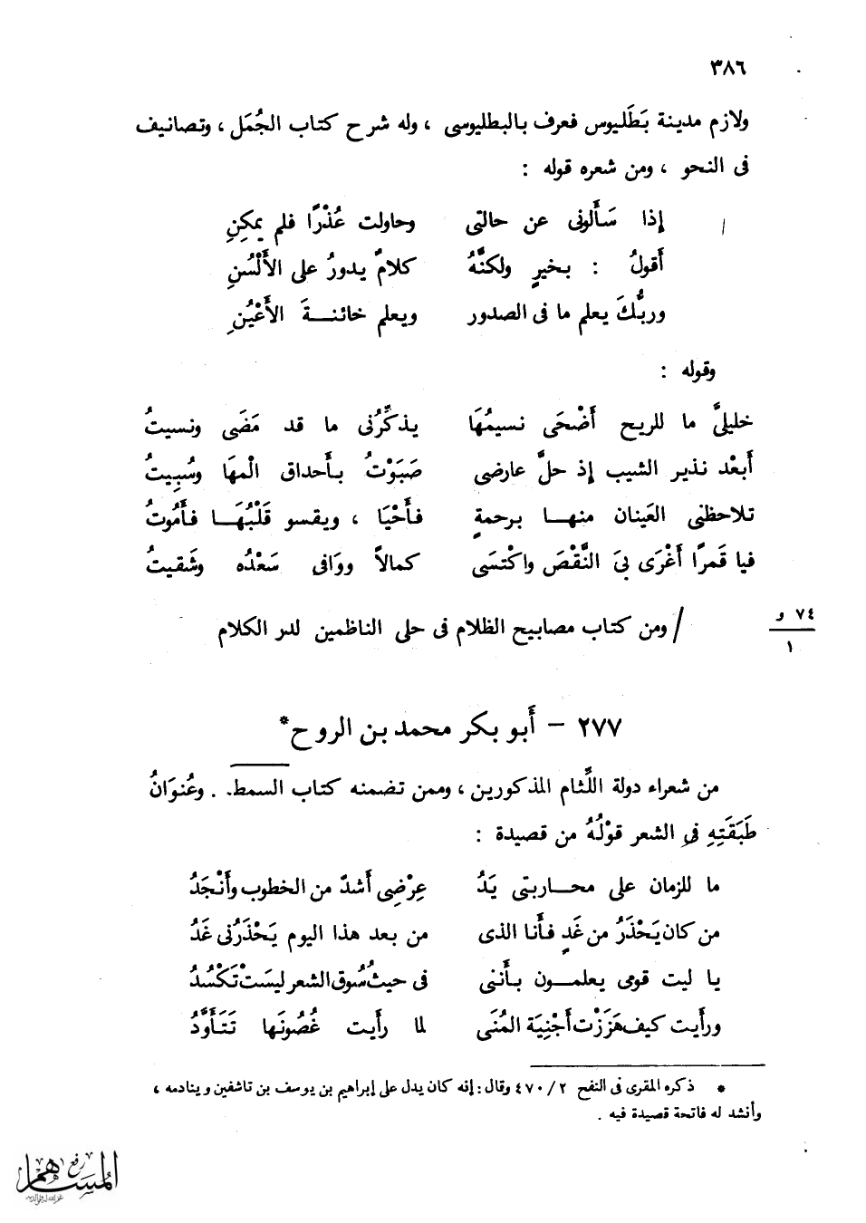 من السمط ذُو اللِّسَان الذلق والجبين الطلق وَالدَّال على كرم الْخلق بِكَمَال الْخلق الَّذِي سَابق فبذ وأشرف وناضل قادة الْكَلَام فأنصف وساجل بحور النثار والنظام فَمَا تلعثم وَلَا توقف وَأثْنى على أَصله وذاته وَأنْشد لَهُ قَوْله ... قَالَت وَقد أَقبلت ألثمها ... والخرص لَا يلوي على الدهش