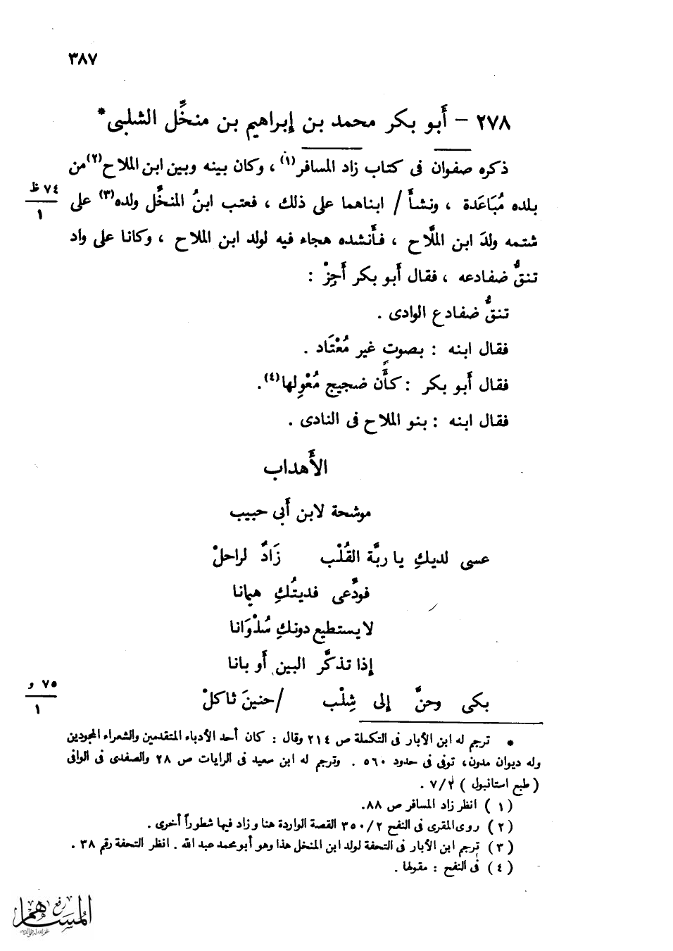 من شعراء الْمِائَة الْخَامِسَة الْمَشْهُورين الْمَذْكُورين فِي = كتاب الذَّخِيرَة وَأحسن مَا وقفت عَلَيْهِ من شعره قَوْله على أَنه قد روى لأبي مُحَمَّد بن سارة وَهُوَ أولى بِهِ ... أَسْنَى ليَالِي الدَّهْر عِنْدِي لَيْلَة ... لم يخل فِيهَا الكاس من إِعْمَال