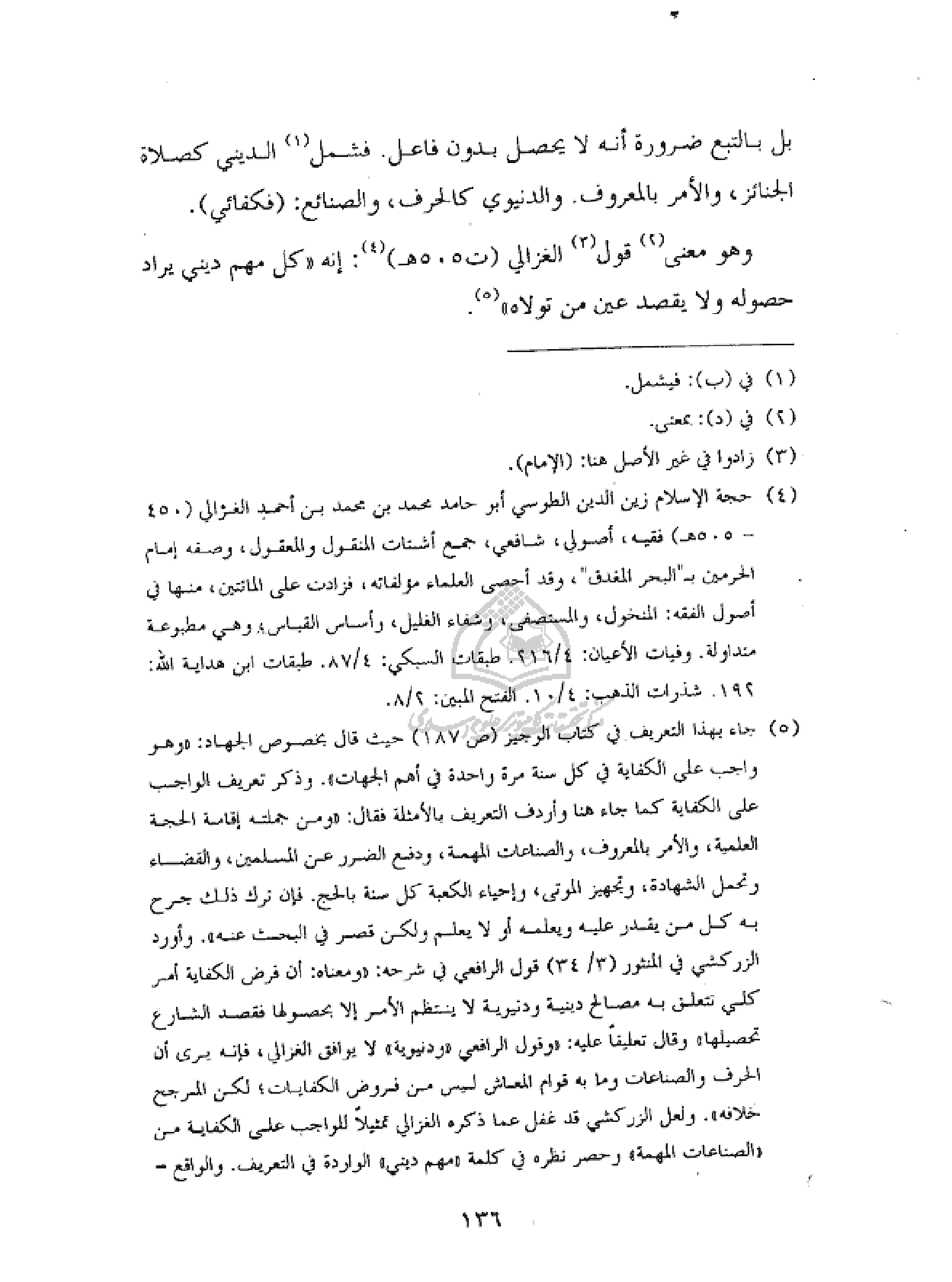 (¬٥) جاء بهذا التعريف في كتاب الوجيز (ص ١٨٧) حيث قال بخصوص الجهاد : «وهو واجب على الكفاية في كل سنة مرة واحدة في أهم الجهات». وذكر تعريف الواجب على الكفاية كما جاء هنا وأردف التعريف بالأمثلة فقال : «ومن جملته إقامة الحجة العلمية، والأمر بالمعروف، والصناعات المهمة، ودفع الضرر عن المسلمين، والقضاء وتحمل الشهادة، وتجهيز الموتى، وإحياء الكعبة كل سنة بالحج. فإن ترك ذلك جرح به كل من يقدر عليه ويعلمه أو لا يعلم ولكن قصر في البحث عنه». وأورد الزركشي في المنثور (٣/ ٣٤) قول الرافعي في شرحه : «ومعناه : أن فرض الكفاية أمر كلي تتعلق به مصالح دينية ودنيوية لا ينتظم الأمر إلا بحصولها فقصد الشارع تحصيلها» وقال تعليقا عليه : «وقول الرافعي «ودنيوية» لا يوافق الغزالي، فإنه يرى أن الحرف والصناعات وما به قوام المعاش ليس من فروض الكفايات؛ لكن المرجح خلافه». ولعل الزركشي قد غفل عما ذكره الغزالي تمثيلا للواجب على الكفاية من «الصناعات المهمة» وحصر نظره في كلمة «مهم ديني» الواردة في التعريف. والواقع -