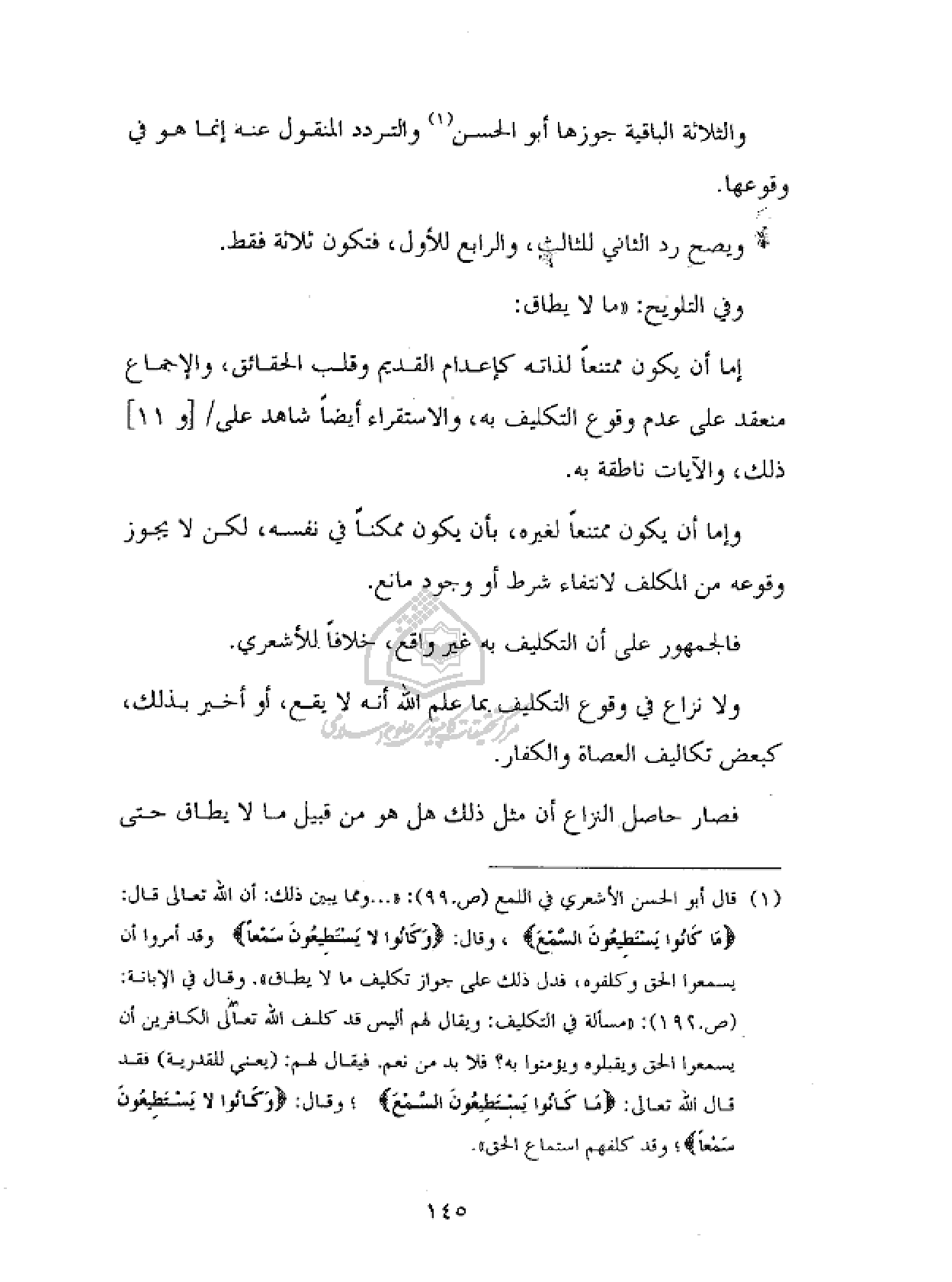 (¬١) قال أبو الحسن الأشعري في اللمع (ص.٩٩) : «. . . ومما يبين ذلك : أن الله تعالى قال : ما كانُوا يَسْتَطِيعُونَ السَّمْعَ، وقال : وَكانُوا لا يَسْتَطِيعُونَ سَمْعاً وقد أمروا أن يسمعوا الحق وكلفوه، فدل ذلك على جواز تكليف ما لا يطاق». وقال في الإبانة : (ص.١٩٢) : «مسألة في التكليف : ويقال لهم أليس قد كلف الله تعالى الكافرين أن يسمعوا الحق ويقبلوه ويؤمنوا به؟ فلابد من نعم. فيقال لهم : (يعني للقدرية) فقد قال الله تعالى : ما كانُوا يَسْتَطِيعُونَ السَّمْعَ؛ وقال : وَكانُوا لا يَسْتَطِيعُونَ سَمْعاً؛ وقد كلفهم استماع الحق».