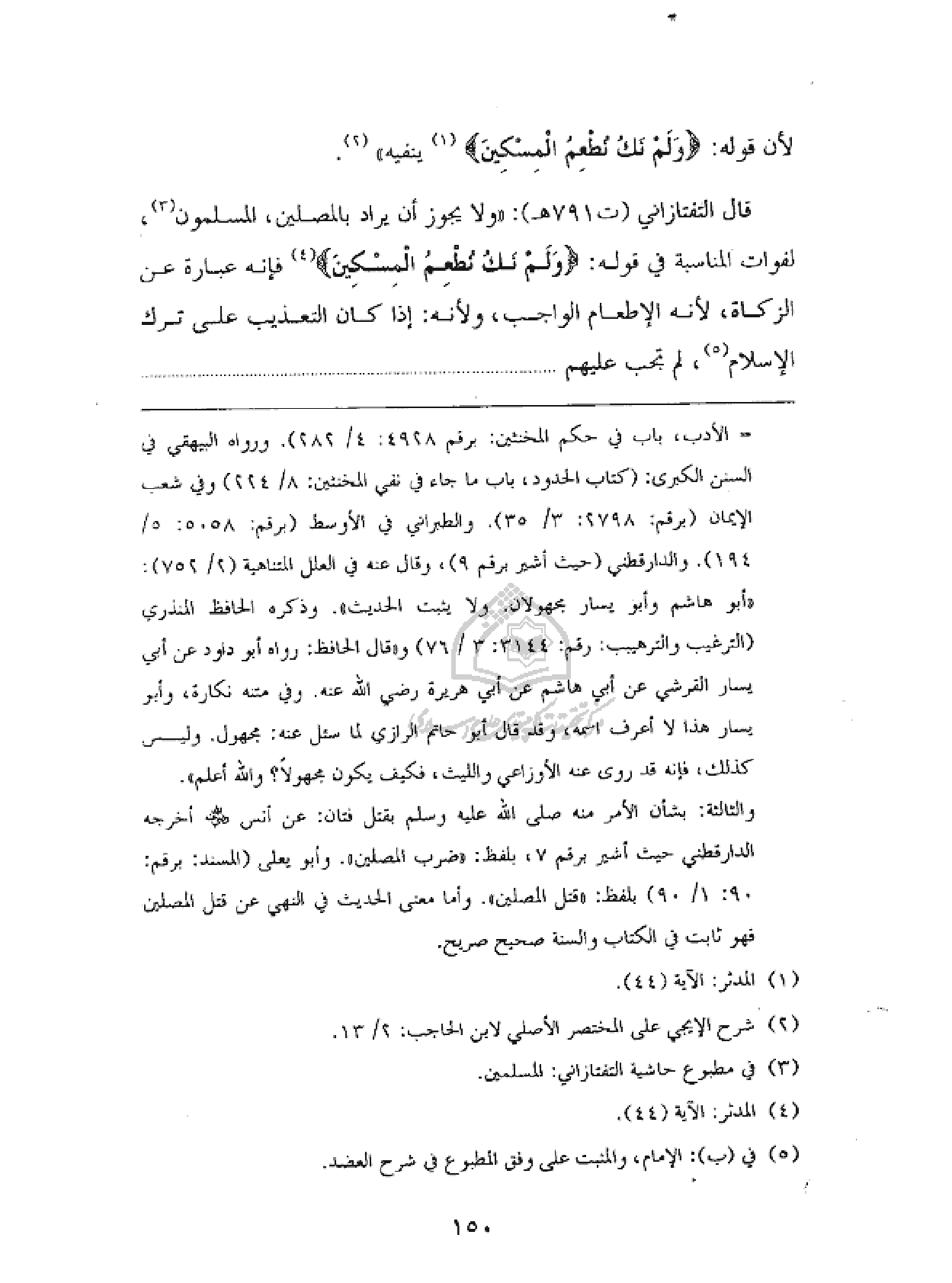 قال التفتازاني (ت ٧٩١ هـ) : «ولا يجوز أن يراد بالمصلين، المسلمون (¬٣)، لفوات المناسبة في قوله : {وَلَمْ نَكُ نُطْعِمُ الْمِسْكِينَ} (¬٤) فإنه عبارة عن الزكاة، لأنه الإطعام الواجب، ولأنه : إذا كان التعذيب على ترك الإسلام (¬٥)، لم تجب عليهم. . .