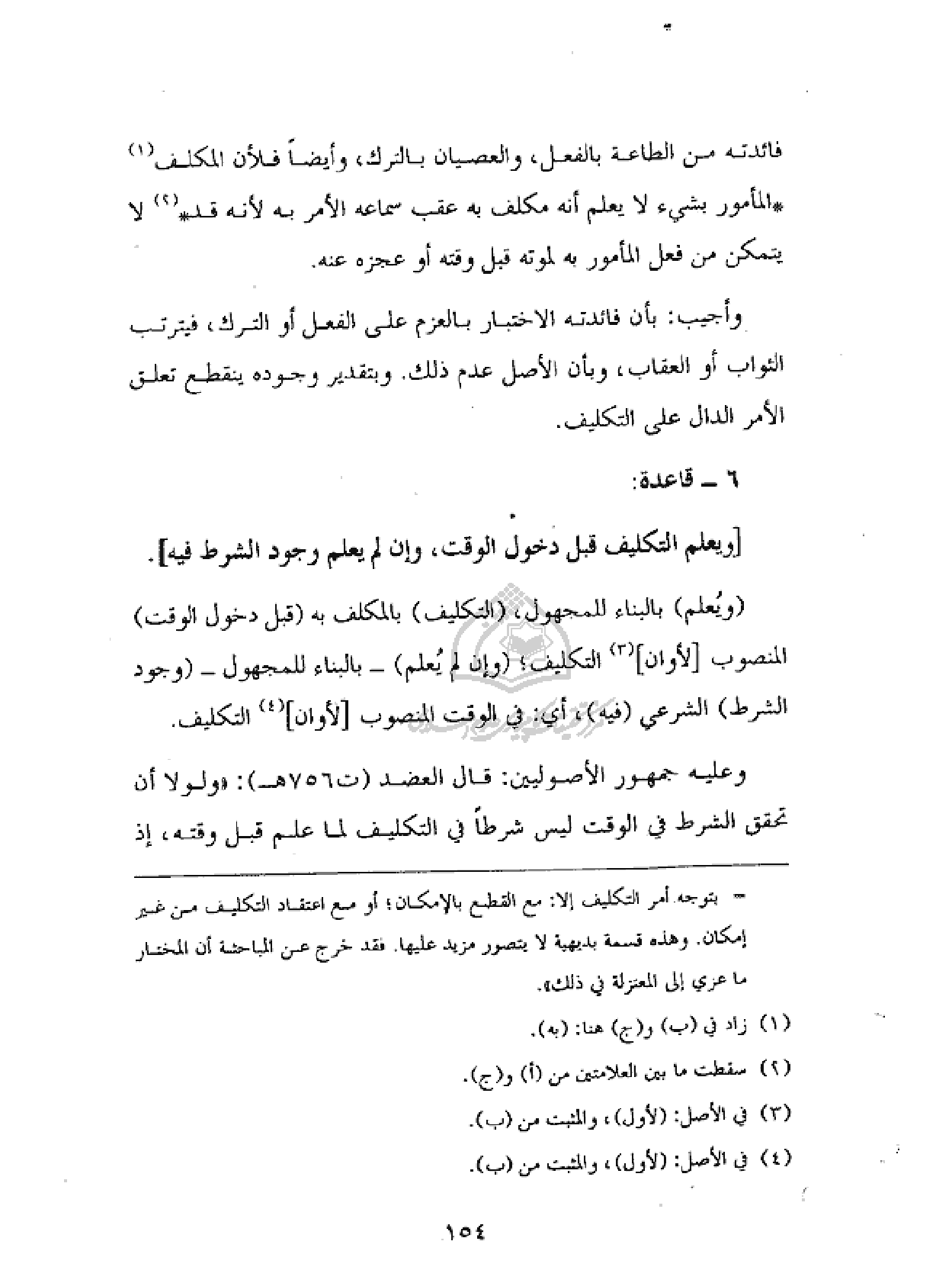 وعليه جمهور الأصوليين: قال العضد (ت ٧٥٦ هـ): «ولولا أن تحقق الشرط في الوقت ليس شرطا في التكليف لما علم قبل وقته، إذ