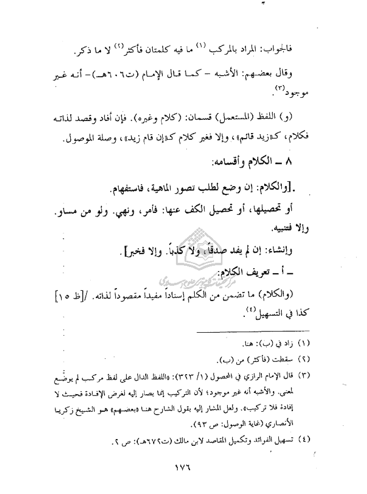 (والكلام) ما تضمن من الكلم إسنادا مفيدا مقصودا لذاته. / [ظ ١٥] كذا في التسهيل (¬٤).