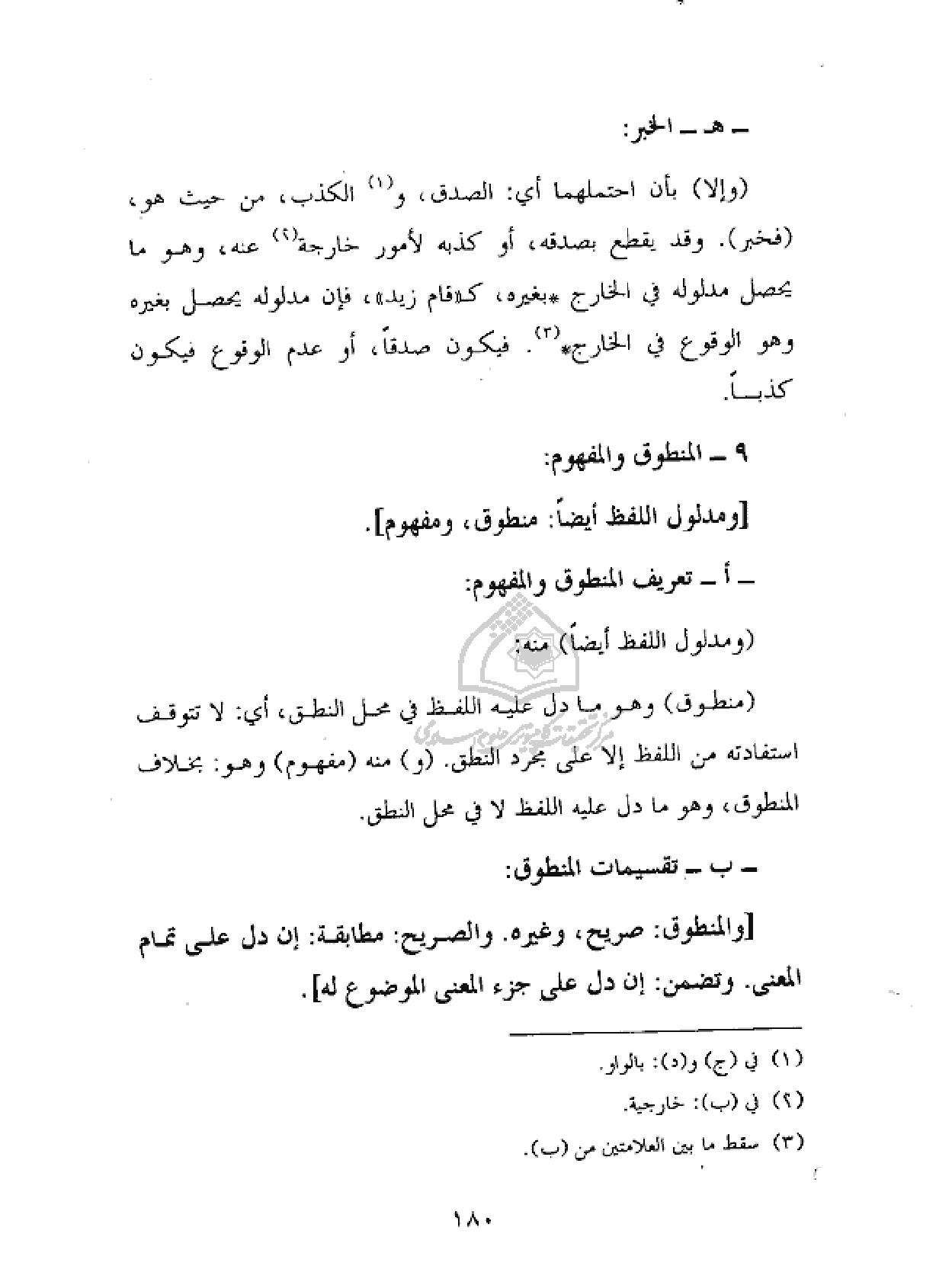 (منطوق) وهو ما دل عليه اللفظ في محل النطق، أي: لا تتوقف استفادته من اللفظ إلا على مجرد النطق. (و) منه (مفهوم) وهو: بخلاف المنطوق، وهو ما دل عليه اللفظ لا في محل النطق.