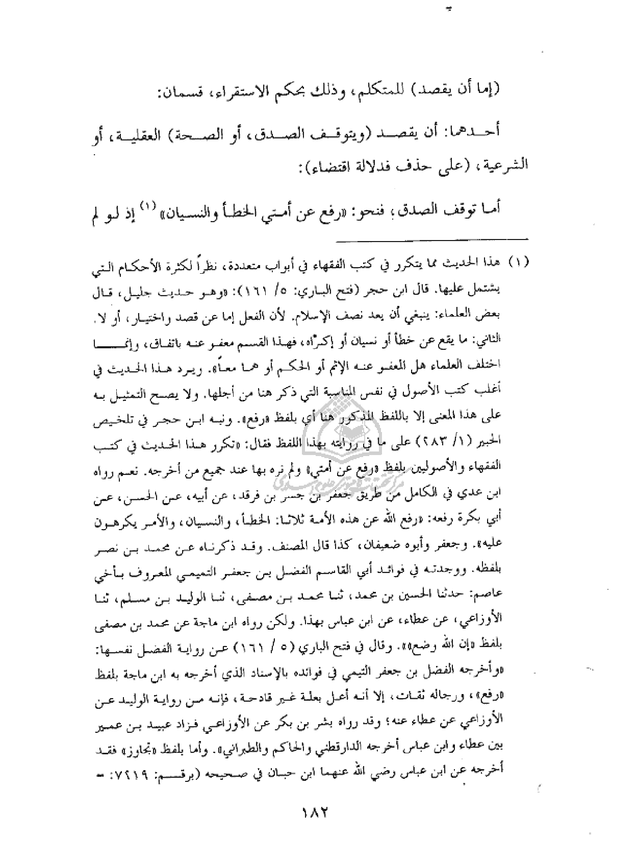 (¬١) هذا الحديث مما يتكرر في كتب الفقهاء في أبواب متعددة، نظرا لكثرة الأحكام التي يشتمل عليها. قال ابن حجر (فتح الباري : ٥/ ١٦١) : «وهو حديث جليل، قال بعض العلماء : ينبغي أن يعد نصف الإسلام. لأن الفعل إما عن قصد واختيار، أو لا. الثاني : ما يقع عن خطأ أو نسيان أو إكراه، فهذا القسم معفو عنه باتفاق، وإنما اختلف العلماء هل المعفو عنه الإثم أو الحكم أو هما معا». ويرد هذا الحديث في أغلب كتب الأصول في نفس المناسبة التي ذكر هنا من أجلها. ولا يصح التمثيل به على هذا المعنى إلا باللفظ المذكور هنا أي بلفظ «رفع». ونبه ابن حجر في تلخيص الحبير (١/ ٢٨٣) على ما في روايته بهذا اللفظ فقال : «تكرر هذا الحديث في كتب الفقهاء والأصوليين بلفظ «رفع عن أمتي» ولم نره بها عند جميع من أخرجه. نعم رواه ابن عدي في الكامل من طريق جعفر بن جسر بن فرقد، عن أبيه، عن الحسن، عن أبي بكرة رفعه : «رفع الله عن هذه الأمة ثلاثا : الخطأ، والنسيان، والأمر يكرهون عليه». وجعفر وأبوه ضعيفان، كذا قال المصنف. وقد ذكرناه عن محمد بن نصر بلفظه. ووجدته في فوائد أبي القاسم الفضل بن جعفر التميمي المعروف بأخي عاصم : حدثنا الحسين بن محمد، ثنا محمد بن مصفى، ثنا الوليد بن مسلم، ثنا الأوزاعي، عن عطاء، عن ابن عباس بهذا. ولكن رواه ابن ماجة عن محمد بن مصفى بلفظ «إن الله وضع»». وقال في فتح الباري (٥/ ١٦١) عن رواية الفضل نفسها : «وأخرجه الفضل بن جعفر التيمي في فوائده بالإسناد الذي أخرجه به ابن ماجة بلفظ «رفع»، ورجاله ثقات، إلا أنه أعل بعلة غير قادحة، فإنه من رواية الوليد عن الأوزاعي عن عطاء عنه؛ وقد رواه بشر بن بكر عن الأوزاعي فزاد عبيد بن عمير بين عطاء وابن عباس أخرجه الدارقطني والحاكم والطبراني». وأما بلفظ «تجاوز» فقد أخرجه عن ابن عباس رضي الله عنهما ابن حبان في صحيحه (برقم : ٧٢١٩ : -