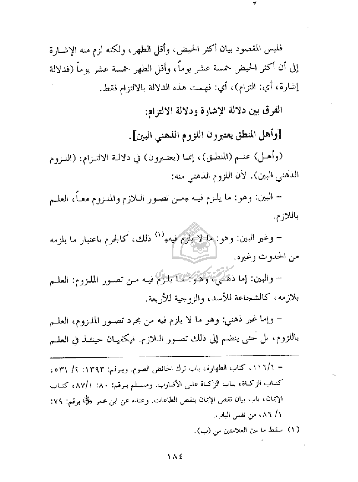 فليس المقصود بيان أكثر الحيض، وأقل الطهر، ولكنه لزم منه الإشارة إلى أن أكثر الحيض خمسة عشر يوما، وأقل الطهر خمسة عشر يوما (فدلالة إشارة، أي: التزام)، أي: فهمت هذه الدلالة بالالتزام فقط.