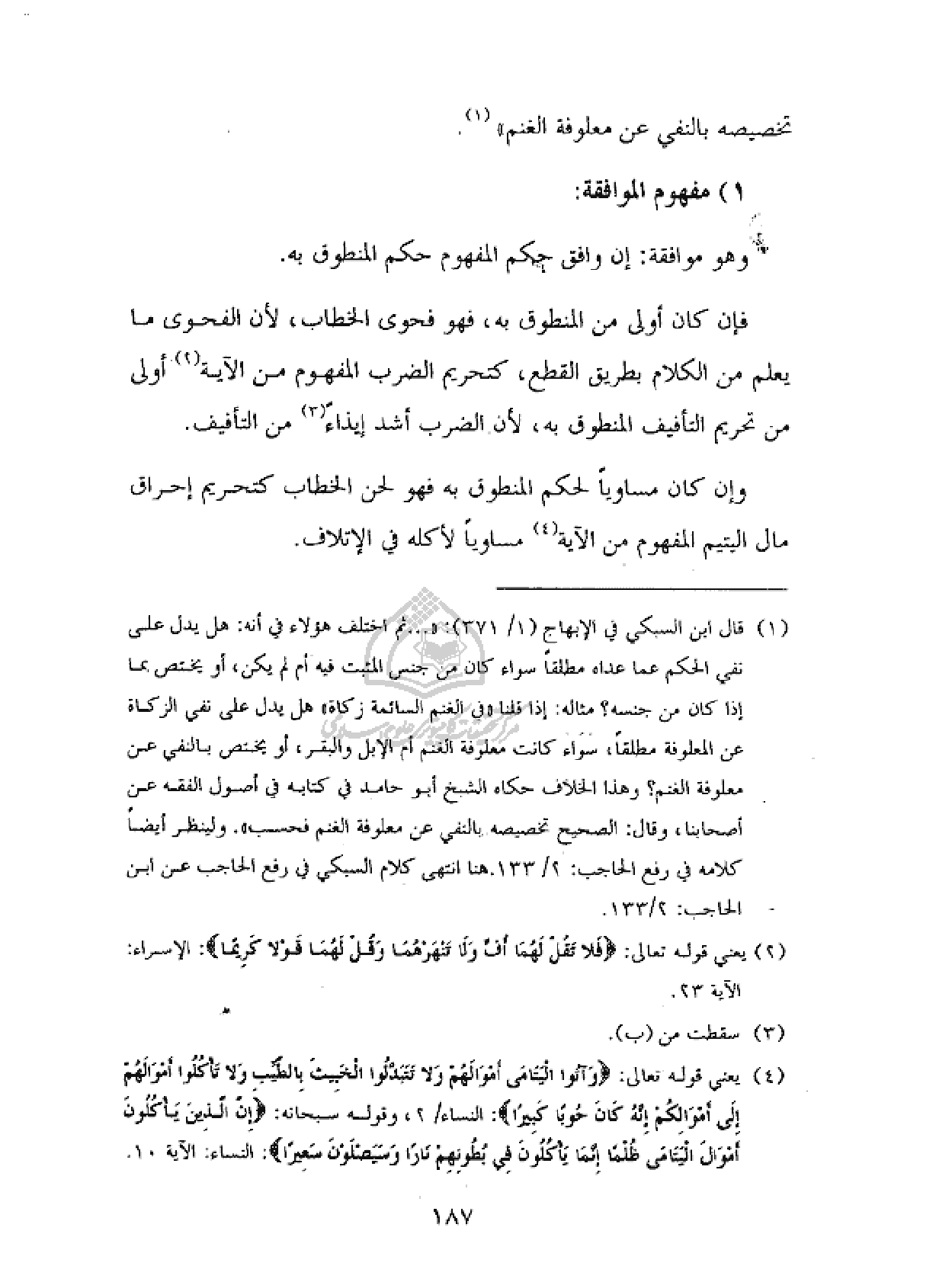(¬١) قال ابن السبكي في الإبهاج (١/ ٣٧١): «. . . ثم اختلف هؤلاء في أنه: هل يدل على نفي الحكم عما عداه مطلقا سواء كان من جنس المثبت فيه أم لم يكن، أو يختص بما إذا كان من جنسه؟ مثاله: إذا قلنا «في الغنم السائمة زكاة» هل يدل على نفي الزكاة عن المعلوفة مطلقا، سواء كانت معلوفة الغنم أم الإبل والبقر، أو يختص بالنفي عن معلوفة الغنم؟ وهذا الخلاف حكاه الشيخ أبو حامد في كتابه في أصول الفقه عن أصحابنا، وقال: الصحيح تخصيصه بالنفي عن معلوفة الغنم فحسب». ولينظر أيضا كلامه في رفع الحاجب: ٢/ ١٣٣. هنا انتهى كلام السبكي في رفع الحاجب عن ابن الحاجب: ٢/ ١٣٣.