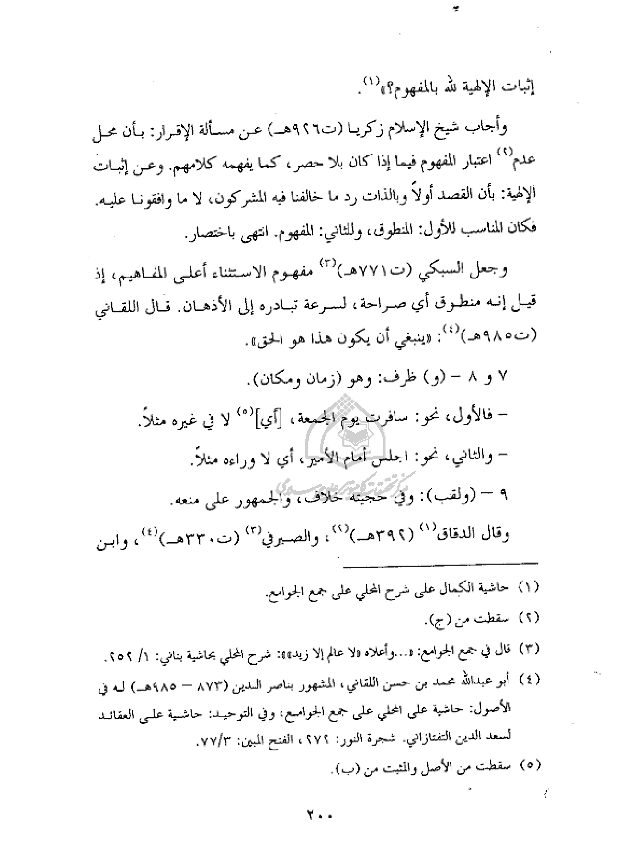 وأجاب شيخ الإسلام زكريا (ت ٩٢٦ هـ) عن مسألة الإقرار: بأن محل عدم (¬٢) اعتبار المفهوم فيما إذا كان بلا حصر، كما يفهمه كلامهم. وعن إثبات الإلهية: بأن القصد أولا وبالذات رد ما خالفنا فيه المشركون، لا ما وافقونا عليه.