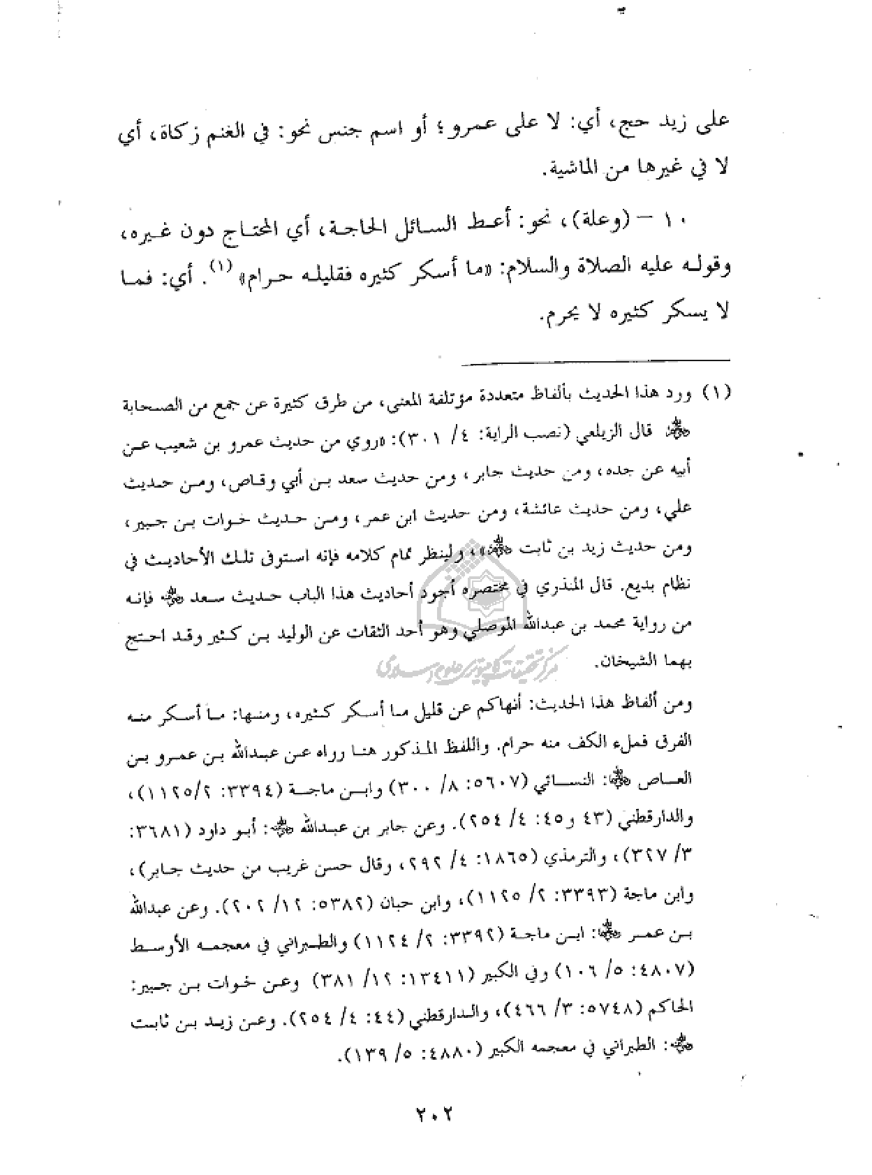 (¬١) ورد هذا الحديث بألفاظ متعددة مؤتلفة المعنى، من طرق كثيرة عن جمع من الصحابة رضي الله عنهم قال الزيلعي (نصب الراية: ٤/ ٣٠١): «روي من حديث عمرو بن شعيب عن أبيه عن جده، ومن حديث جابر، ومن حديث سعد بن أبي وقاص، ومن حديث علي، ومن حديث عائشة، ومن حديث ابن عمر، ومن حديث خوات بن جبير، ومن حديث زيد بن ثابت رضي الله عنهم»، ولينظر تمام كلامه فإنه استوفى تلك الأحاديث في نظام بديع. قال المنذري في مختصره أجود أحاديث هذا الباب حديث سعد رضي الله عنه فإنه من رواية محمد بن عبد الله الموصلي وهو أحد الثقات عن الوليد بن كثير وقد احتج بهما الشيخان. ومن ألفاظ هذا الحديث: أنهاكم عن قليل ما أسكر كثيره، ومنها: ما أسكر منه الفرق فملء الكف منه حرام. واللفظ المذكور هنا رواه عن عبد الله بن عمرو بن العاص رضي الله عنهما: النسائي (٥٦٠٧: ٨/ ٣٠٠) وابن ماجة (٣٣٩٤: ٢/ ١١٢٥)، والدارقطني (٤٣ و ٤٥: ٤/ ٢٥٤). وعن جابر بن عبد الله رضي الله عنه: أبو داود (٣٦٨١: ٣/ ٣٢٧)، والترمذي (١٨٦٥: ٤/ ٢٩٢، وقال حسن غريب من حديث جابر)، وابن ماجة (٣٣٩٣: ٢/ ١١٢٥)، وابن حبان (٥٣٨٢: ١٢/ ٢٠٢). وعن عبد الله بن عمر رضي الله عنهما: ابن ماجة (٣٣٩٢: ٢/ ١١٢٤) والطبراني في معجمه الأوسط (٤٨٠٧: ٥/ ١٠٦) وفي الكبير (١٣٤١١: ١٢/ ٣٨١) وعن خوات بن جبير: الحاكم (٥٧٤٨: ٣/ ٤٦٦)، والدارقطني (٤٤: ٤/ ٢٥٤). وعن زيد بن ثابت رضي الله عنه: الطبراني في معجمه الكبير (٤٨٨٠: ٥/ ١٣٩).