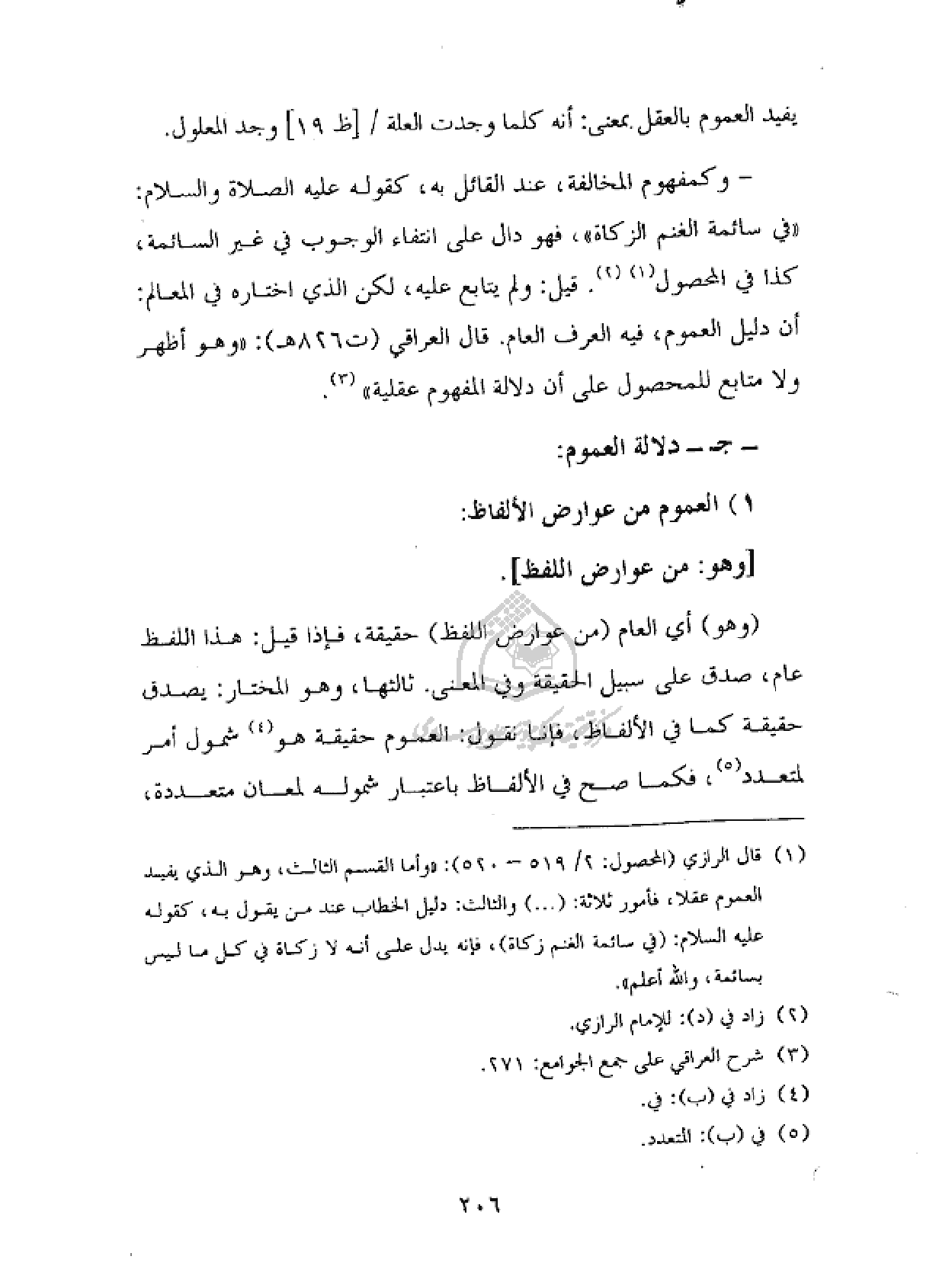 (¬١) قال الرازي (المحصول: ٢/ ٥١٩ - ٥٢٠): «وأما القسم الثالث، وهو الذي يفيد العموم عقلا، فأمور ثلاثة: (. . .) والثالث: دليل الخطاب عند من يقول به، كقوله عليه السلام: (في سائمة الغنم زكاة)، فإنه يدل على أنه لا زكاة في كل ما ليس بسائمة، والله أعلم».