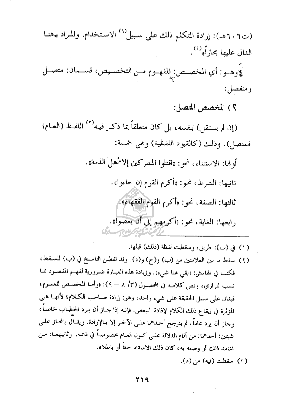 (¬٢) سقط ما بين العلامتين من (ب) و (ج) و (د). وقد تفطن الناسخ في (ب) للسقط، فكتب في الهامش: «بقي هنا شيء». وزيادة هذه العبارة ضرورية لفهم المقصود مما نسب للرازي، ونص كلامه في المحصول (٣/ ٨ - ٩): «وأما المخصص للعموم، فيقال على سبيل الحقيقة على شيء واحد، وهو: إرادة صاحب الكلام؛ لأنها هي المؤثرة في إيقاع ذلك الكلام لإفادة البعض. فإنه إذا جاز أن يرد الخطاب خاصا، وجاز أن يرد عاما، لم يترجح أحدهما على الآخر إلا بالإرادة. ويقال بالمجاز على شيئين: أحدهما: من أقام الدلالة على كون العام مخصوصا في ذاته. وثانيهما: من اعتقد ذلك أو وصفه به، كان ذلك الاعتقاد حقا أو باطلا».