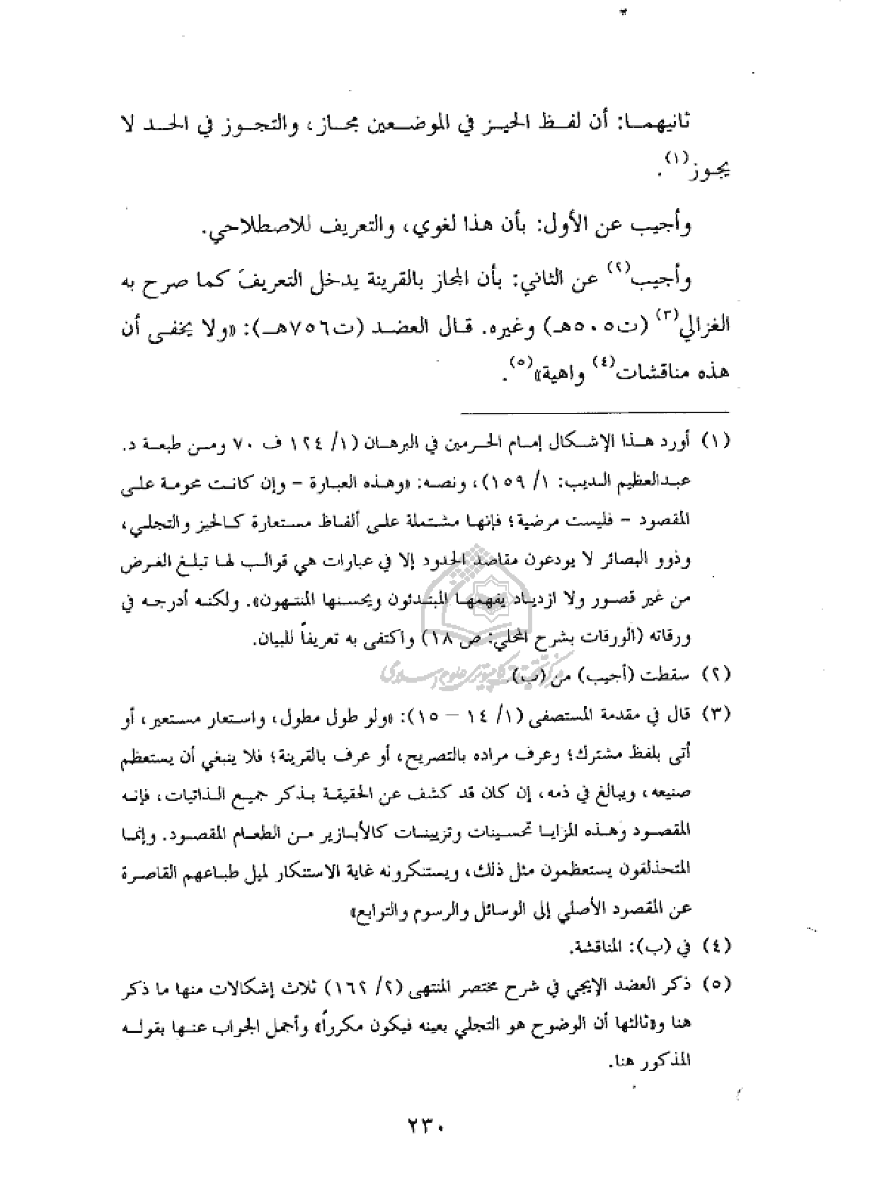 وأجيب (¬٢) عن الثاني : بأن المجاز بالقرينة يدخل التعريف كما صرح به الغزالي (¬٣) (ت ٥٠٥ هـ) وغيره. قال العضد (ت ٧٥٦ هـ) : «ولا يخفى أن هذه مناقشات (¬٤) واهية» (¬٥).