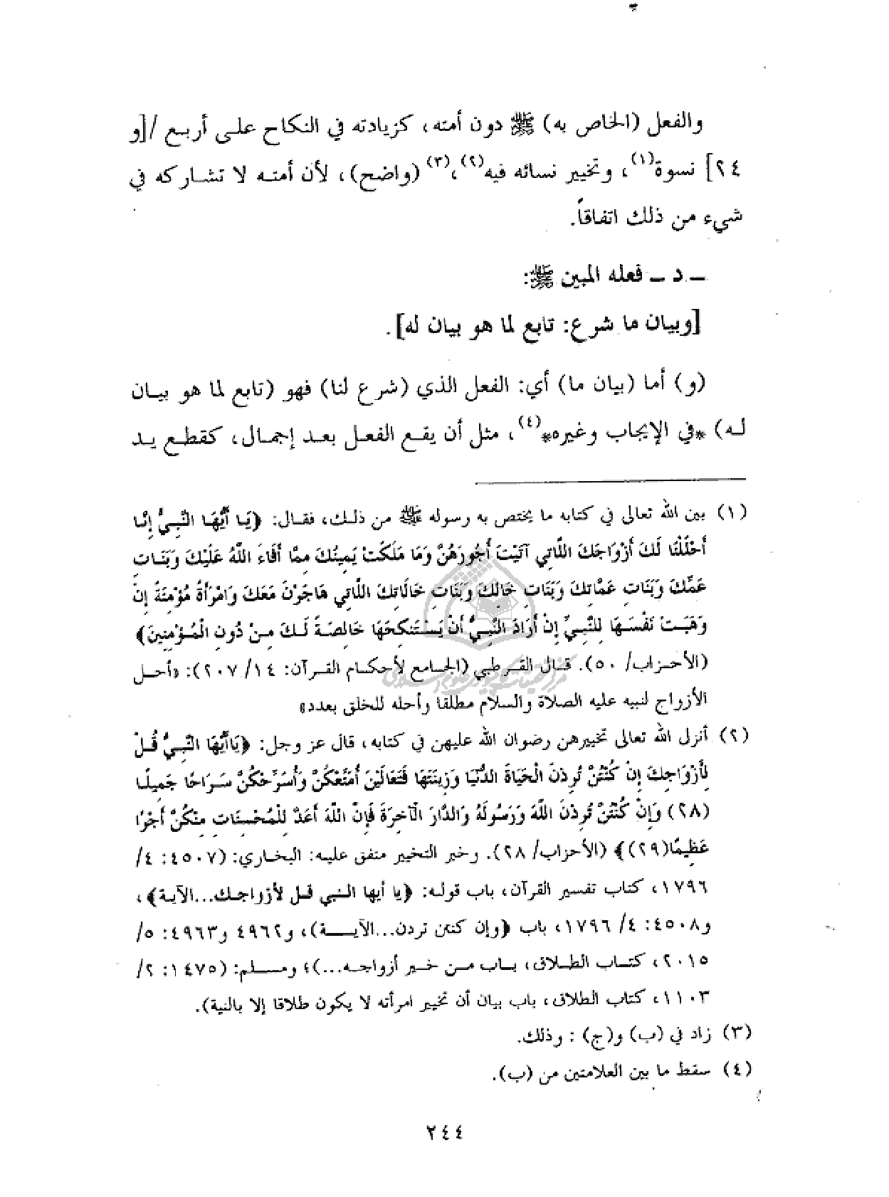 والفعل (الخاص به) صلّى الله عليه وسلم دون أمته، كزيادته في النكاح على أربع/ [و ٢٤] نسوة (¬١)، وتخيير نسائه فيه (¬٢)، (¬٣) (واضح)، لأن أمته لا تشاركه في شيء من ذلك اتفاقا.