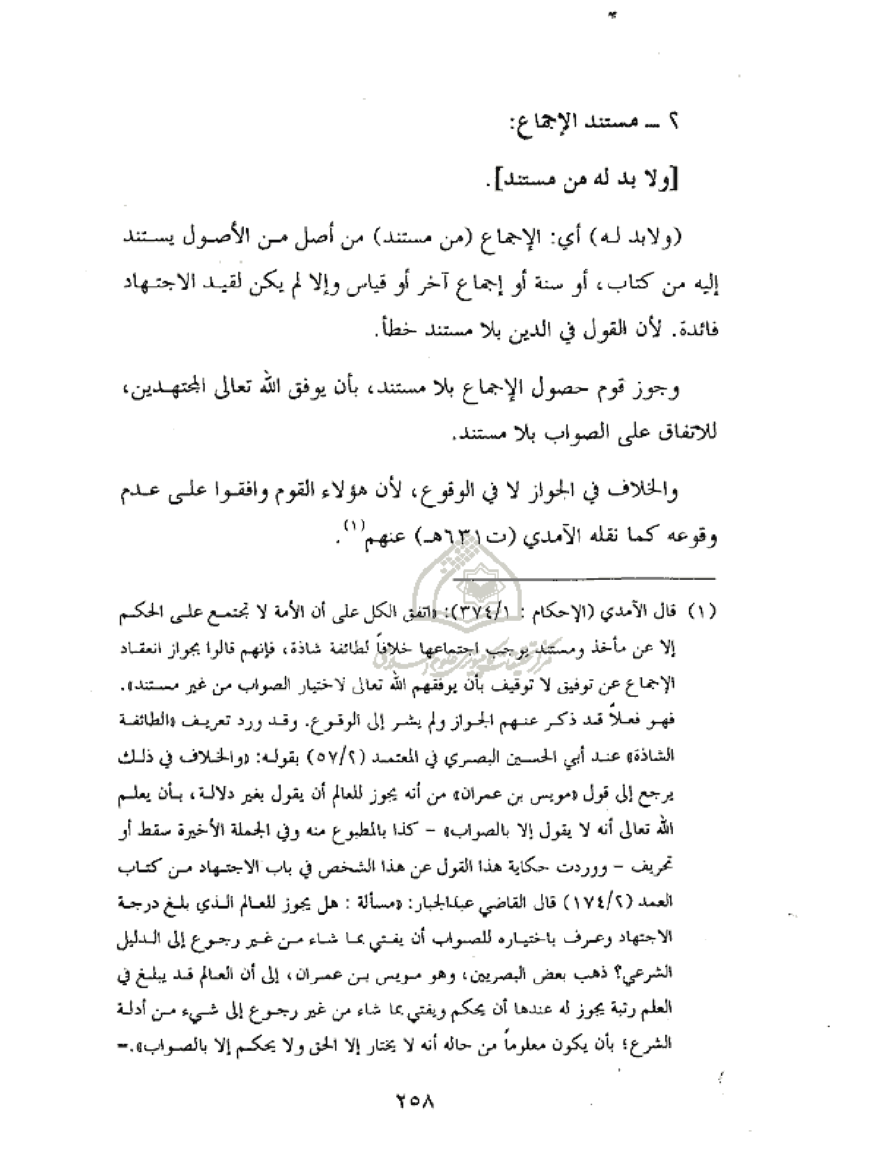 (¬١) قال الآمدي (الإحكام: ١/ ٣٧٤): «اتفق الكل على أن الأمة لا تجتمع على الحكم إلا عن مأخذ ومستند يوجب اجتماعها خلافا لطائفة شاذة، فإنهم قالوا بجواز انعقاد الإجماع عن توفيق لا توقيف بأن يوفقهم الله تعالى لاختيار الصواب من غير مستند». فهو فعلا قد ذكر عنهم الجواز ولم يشر إلى الوقوع. وقد ورد تعريف «الطائفة الشاذة» عند أبي الحسين البصري في المعتمد (٢/ ٥٧) بقوله: «والخلاف في ذلك يرجع إلى قول «مويس بن عمران» من أنه يجوز للعالم أن يقول بغير دلالة، بأن يعلم الله تعالى أنه لا يقول إلا بالصواب» - كذا بالمطبوع منه وفي الجملة الأخيرة سقط أو تحريف - ووردت حكاية هذا القول عن هذا الشخص في باب الاجتهاد من كتاب العمد (٢/ ١٧٤) قال القاضي عبد الجبار: «مسألة: هل يجوز للعالم الذي بلغ درجة الاجتهاد وعرف باختياره للصواب أن يفتي بما شاء من غير رجوع إلى الدليل الشرعي؟ ذهب بعض البصريين، وهو مويس بن عمران، إلى أن العالم قد يبلغ في العلم رتبة يجوز له عندها أن يحكم ويفتي بما شاء من غير رجوع إلى شيء من أدلة الشرع؛ بأن يكون معلوما من حاله أنه لا يختار إلا الحق ولا يحكم إلا بالصواب». -