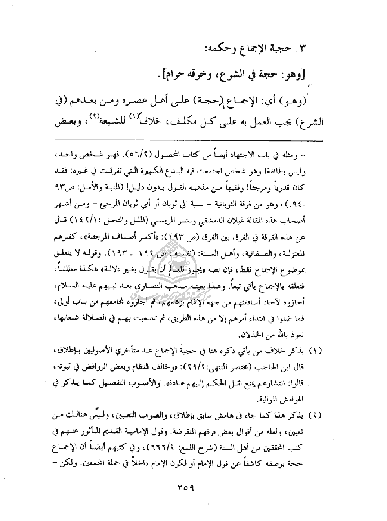(¬١) يذكر خلاف من يأتي ذكره هنا في حجية الإجماع عند متأخري الأصوليين بإطلاق، قال ابن الحاجب (مختصر المنتهى: ٢/ ٢٩): «وخالف النظام وبعض الروافض في ثبوته، قالوا: انتشارهم يمنع نقل الحكم إليهم عادة». والأصوب التفصيل كما يذكر في الهوامش الموالية.